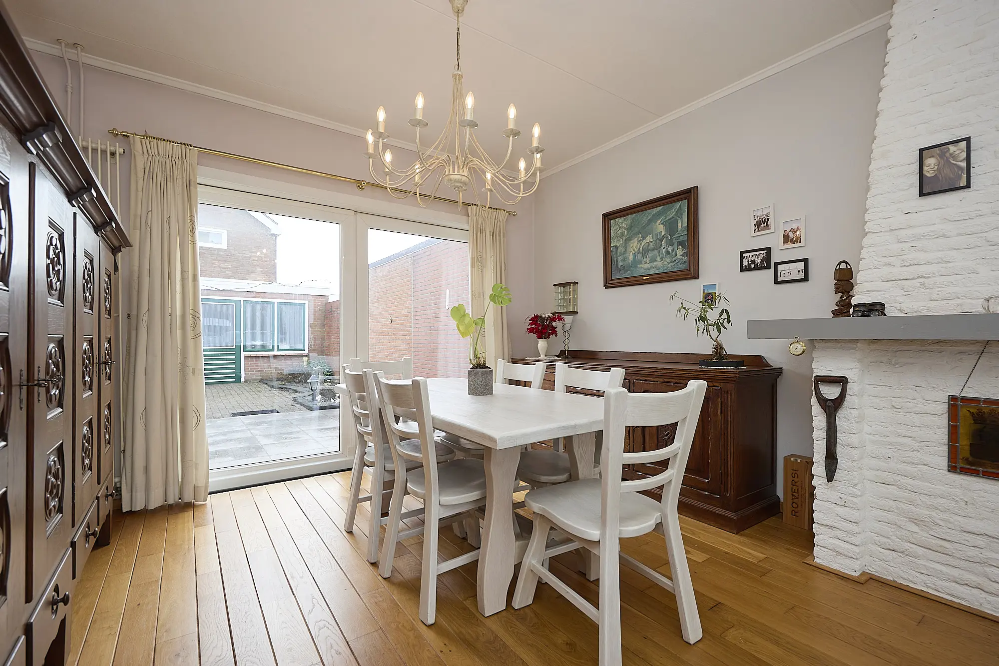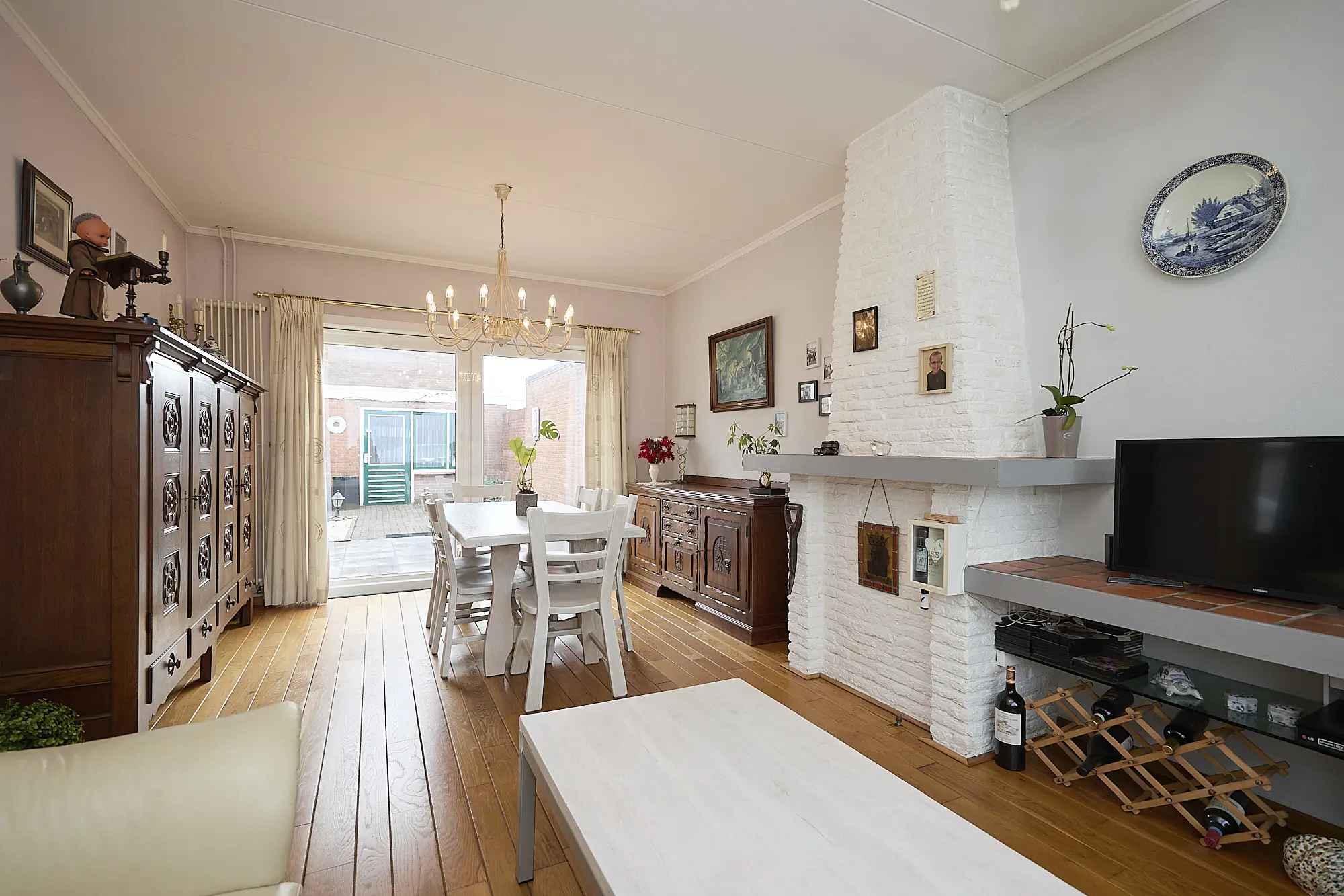 De lichte woonkamer is afgewerkt met een nette houten vloer en beschikt over een grote schuifpui naar de tuin, wat zorgt voor veel lichtinval en een prettige verbinding tussen binnen en buiten.