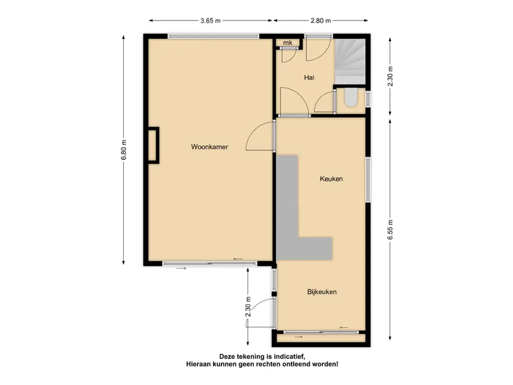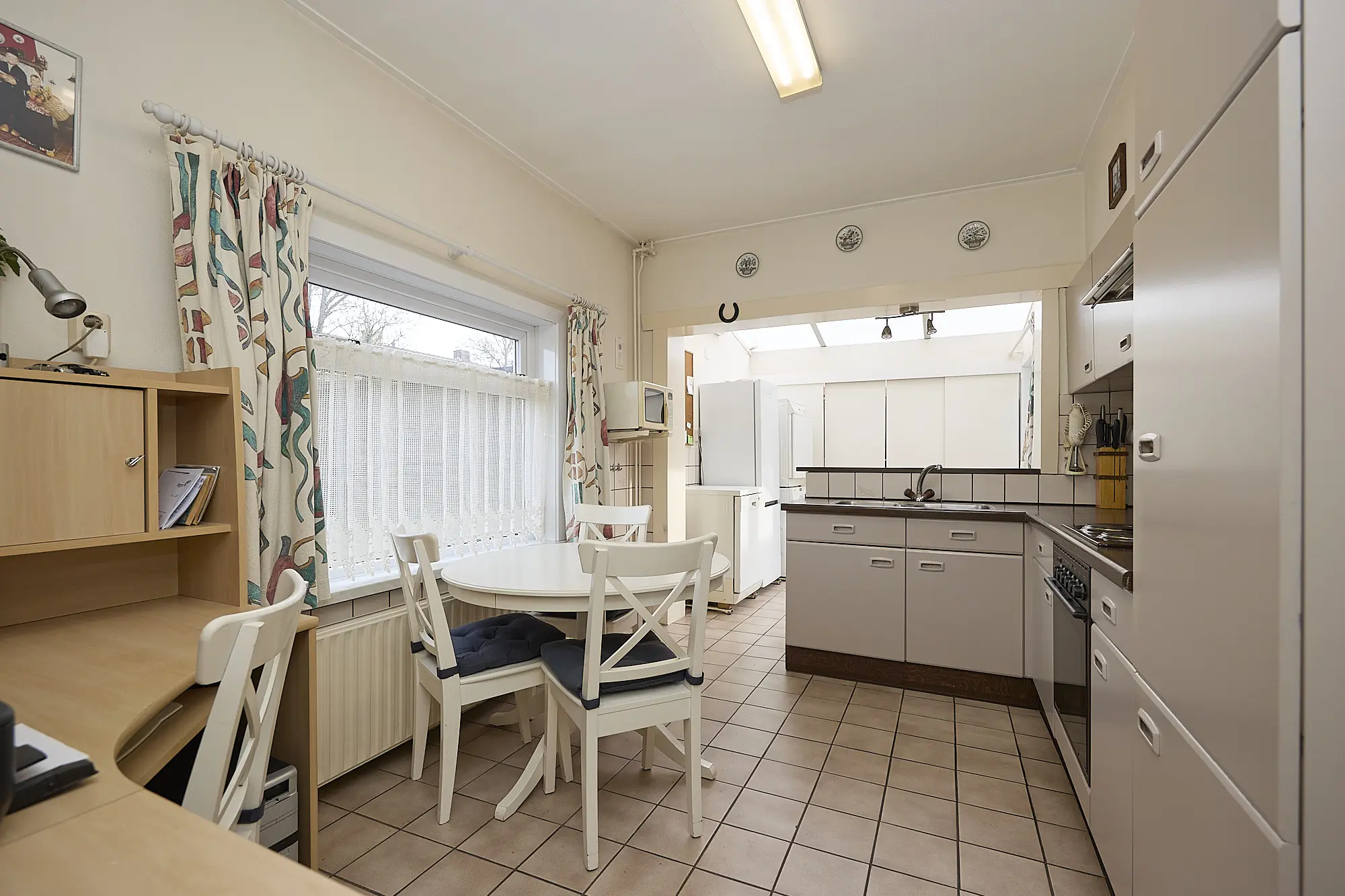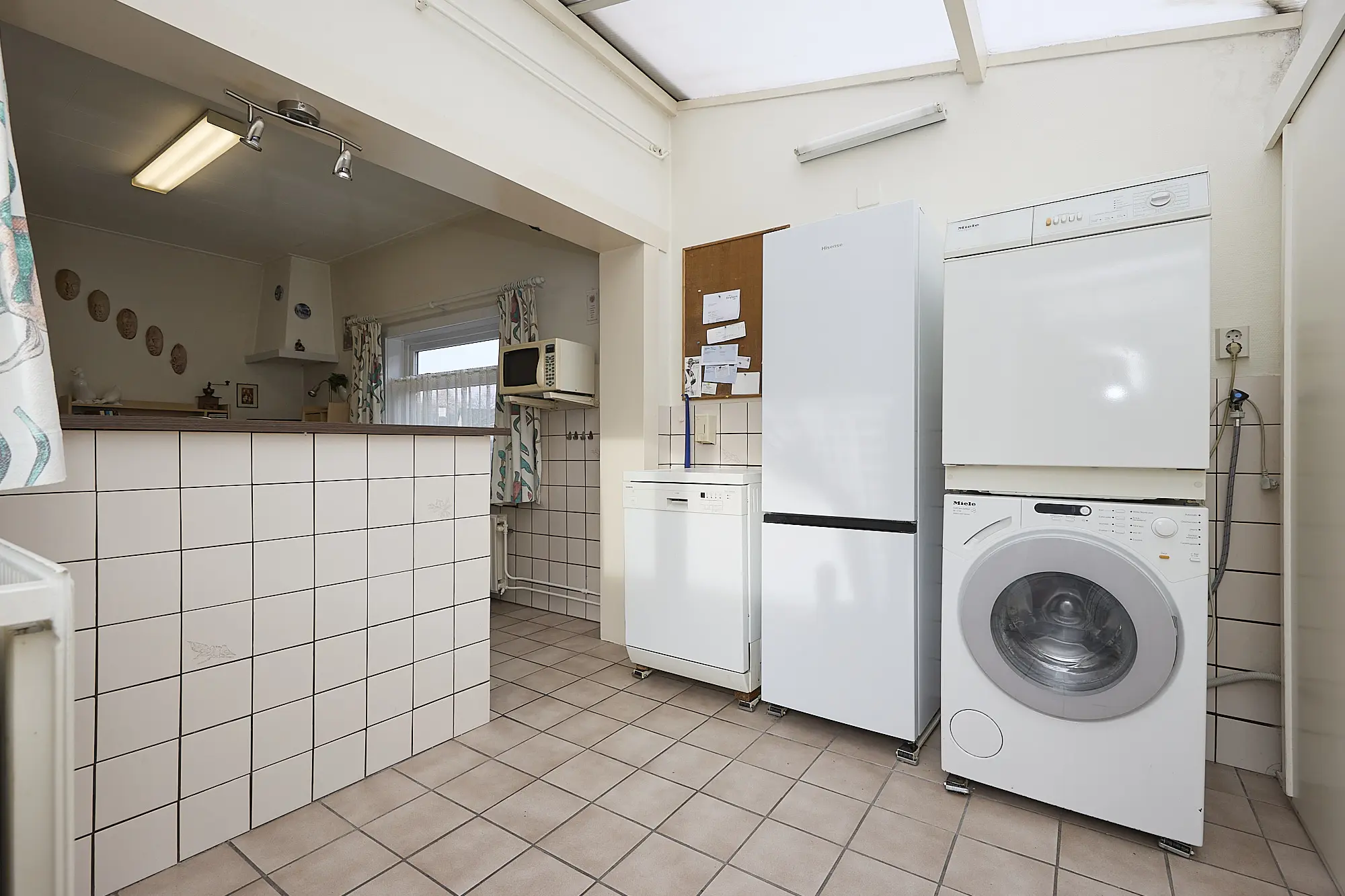 Je komt binnen via een ruime hal met nette toiletruimte, meterkast en garderobe. Vanuit de hal bereik je de royale woonkeuken met een verzorgd keukenblok in hoekopstelling, voorzien van een fornuis met oven en afzuigkap. Er is volop ruimte voor een gezellige eethoek. Aansluitend bevindt zich de aangebouwde bijkeuken met veel extra bergruimte, aansluitingen voor witgoed en plaats voor een koelkast en vriezer. Vanuit de bijkeuken is er directe toegang tot de tuin.