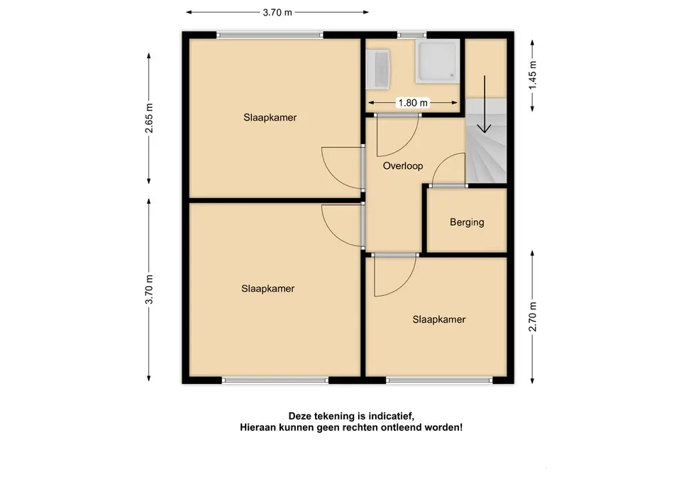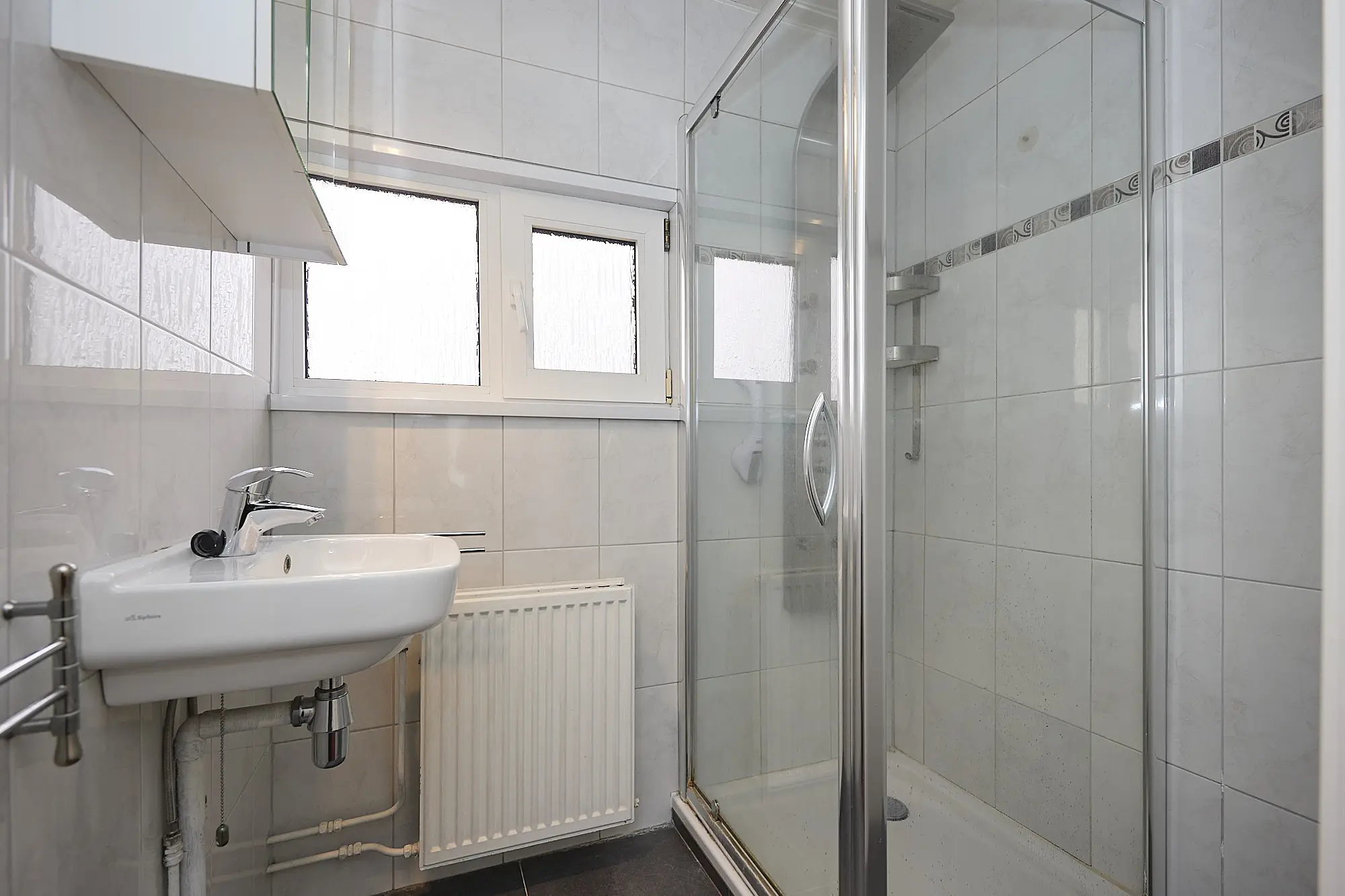 Op de eerste verdieping bevinden zich drie volwaardige slaapkamers en een ruime berging op de overloop. De badkamer is netjes uitgevoerd en voorzien van een douchecabine en wastafel.