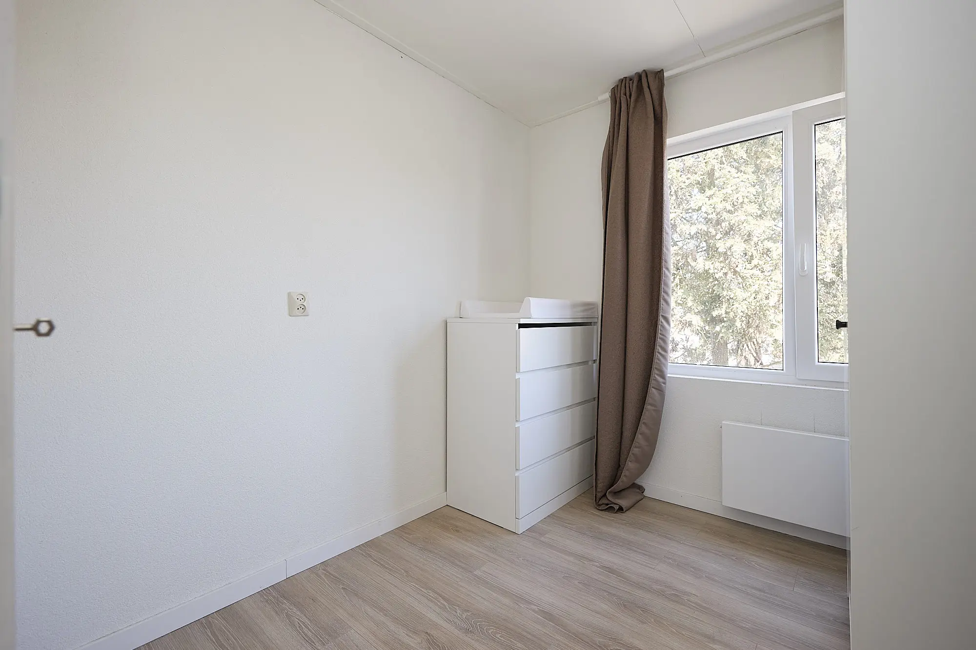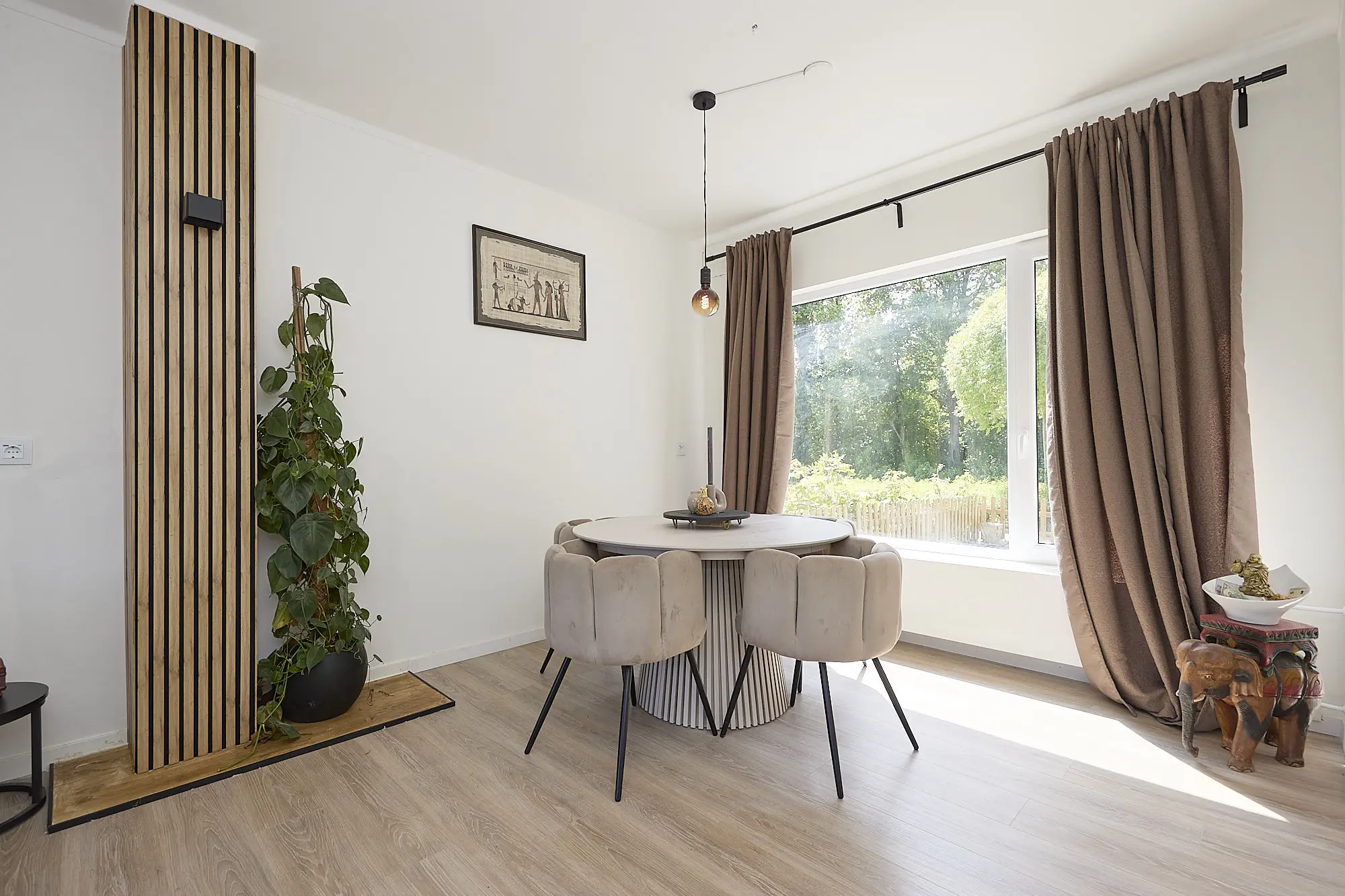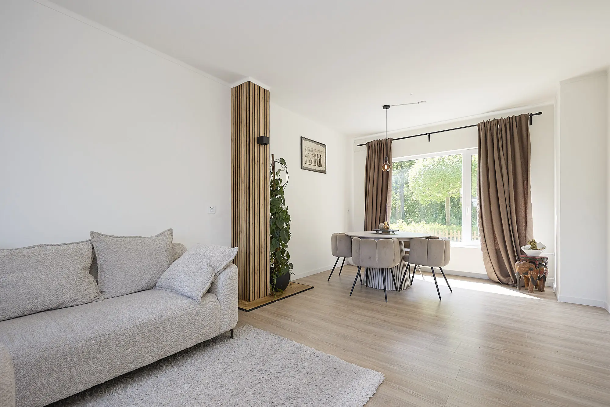 De woonkamer is licht en verzorgd, voorzien van een nette laminaatvloer en heeft een prettig uitzicht op de achtertuin.