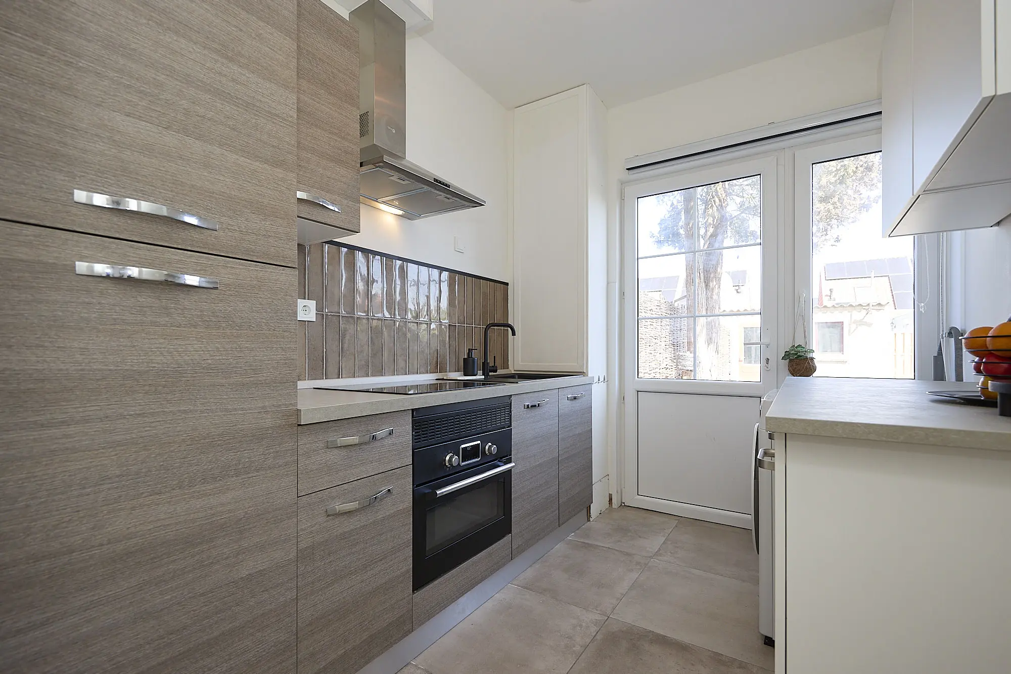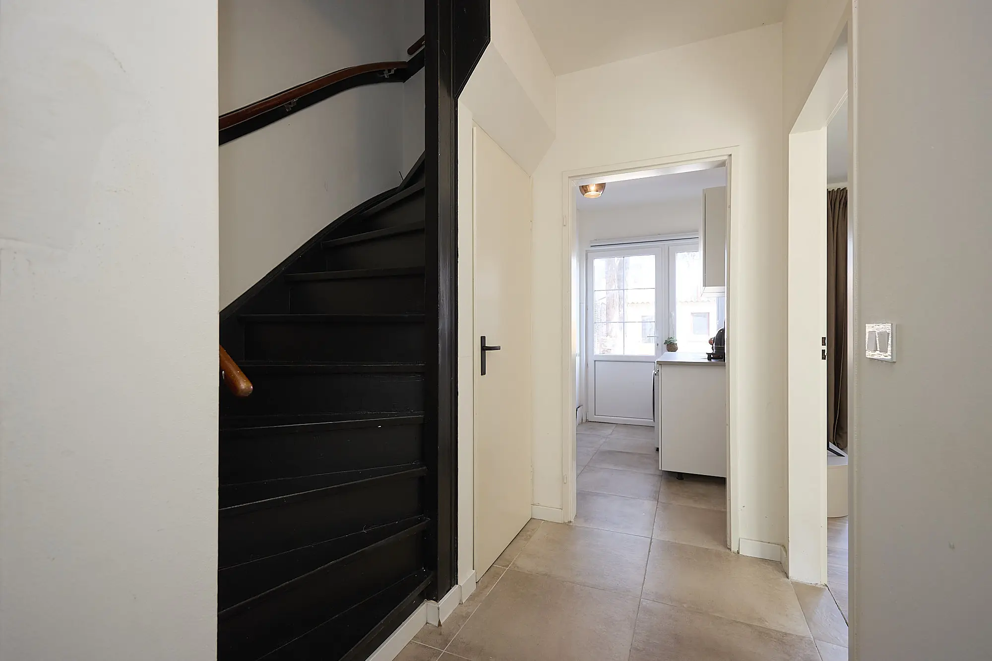 Via de entree komt u in de hal met meterkast, een moderne toiletruimte, trapopgang naar de eerste verdieping en een praktische trapkast. De dichte keuken beschikt over een modern keukenblok, compleet met inductiekookplaat, afzuigkap, combi-oven en vaatwasser. De keuken is afgewerkt met een stijlvolle plavuizenvloer en biedt directe toegang tot de tuin.