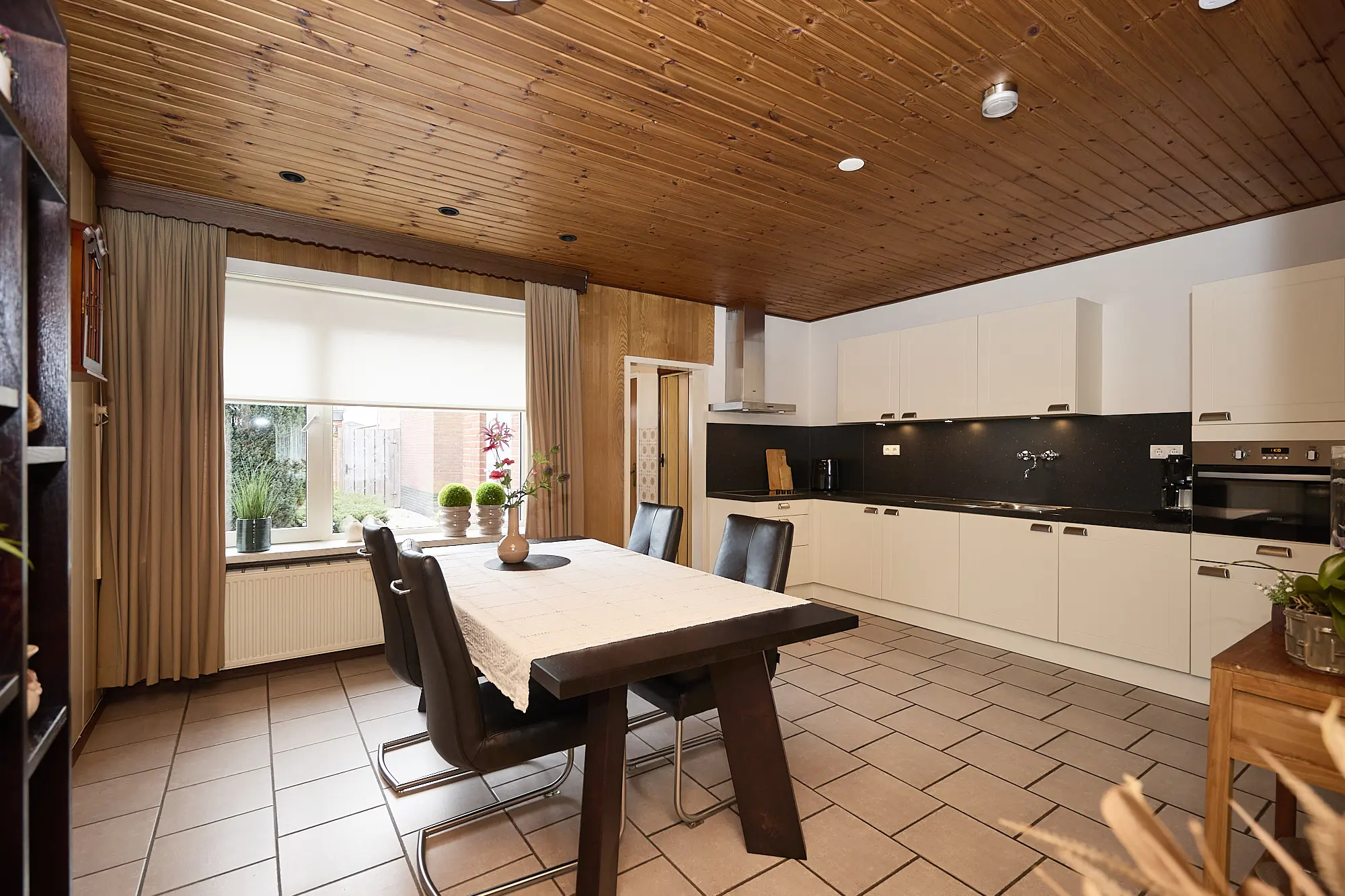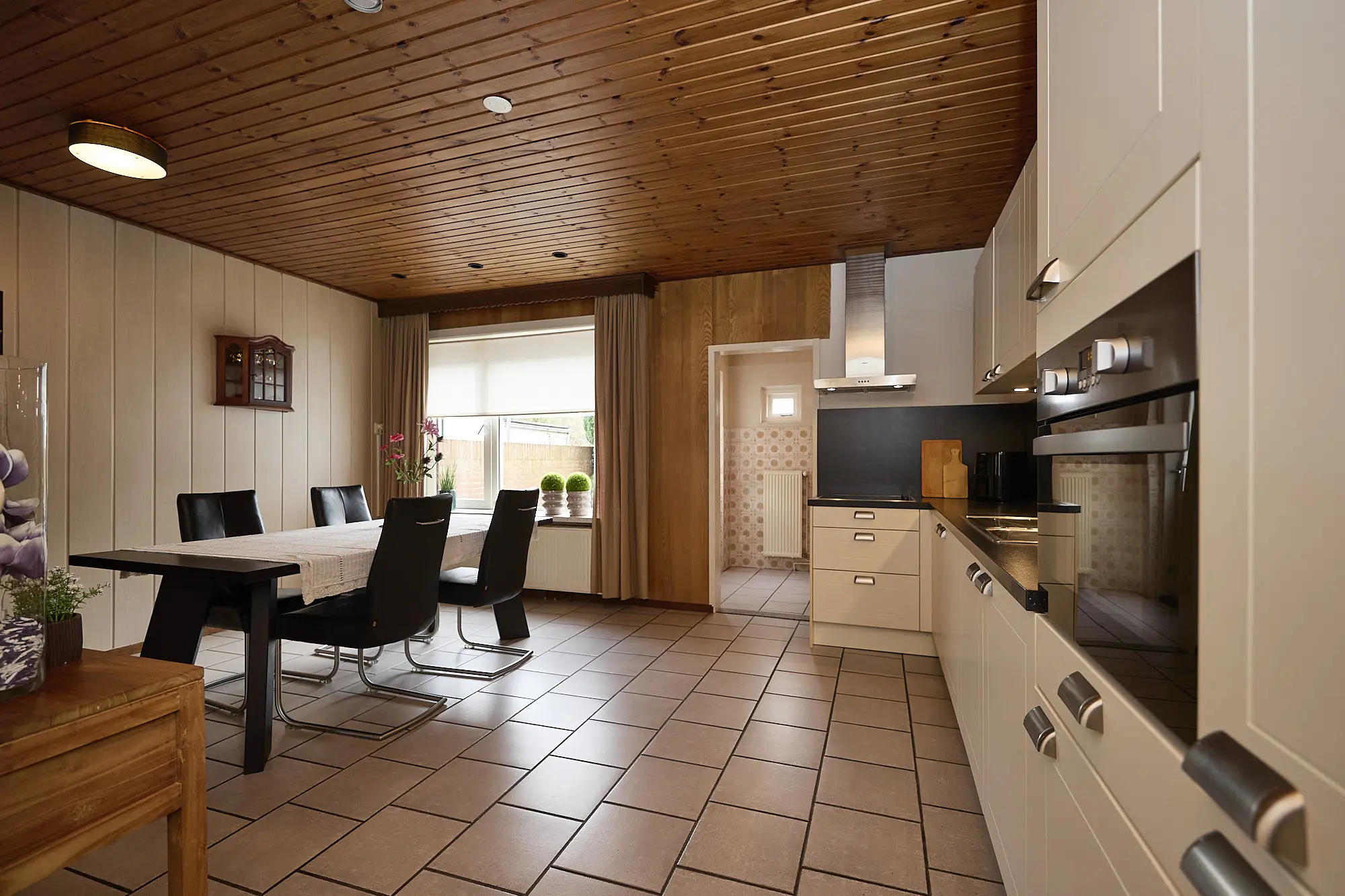 Binnenkomst via de hal met meterkast, bergruimte en trap naar de eerste verdieping. Sfeervolle woonkamer met zitgedeelte en eetgedeelte met open keuken, de keuken vormt een fijne plek om gezellig te koken en samen te eten. De keuken beschikt over een keramische kookplaat, afzuigkap, combi-oven en koelkast met vriesvak.