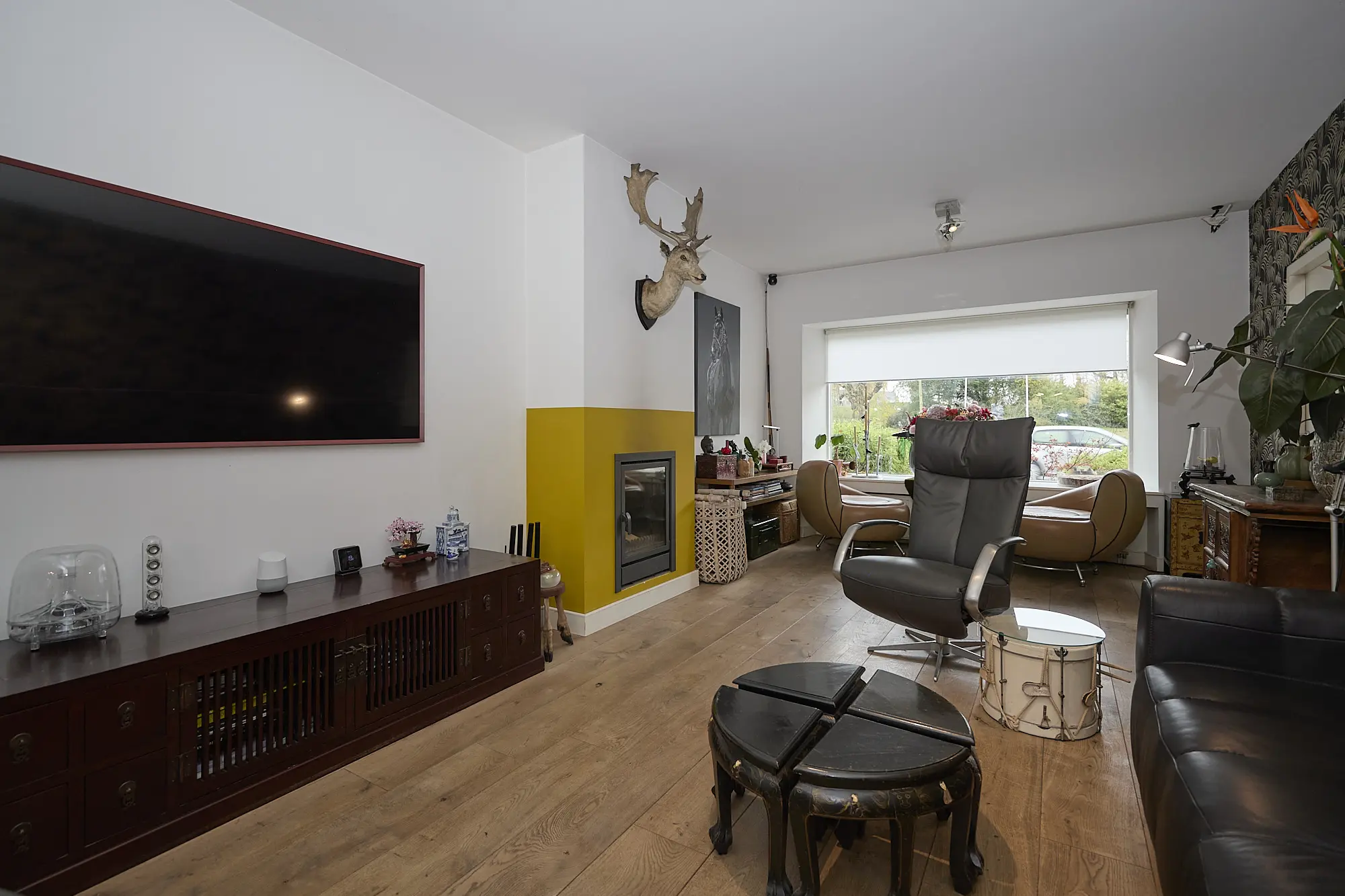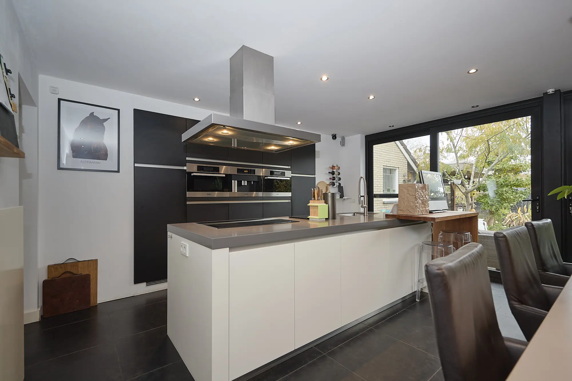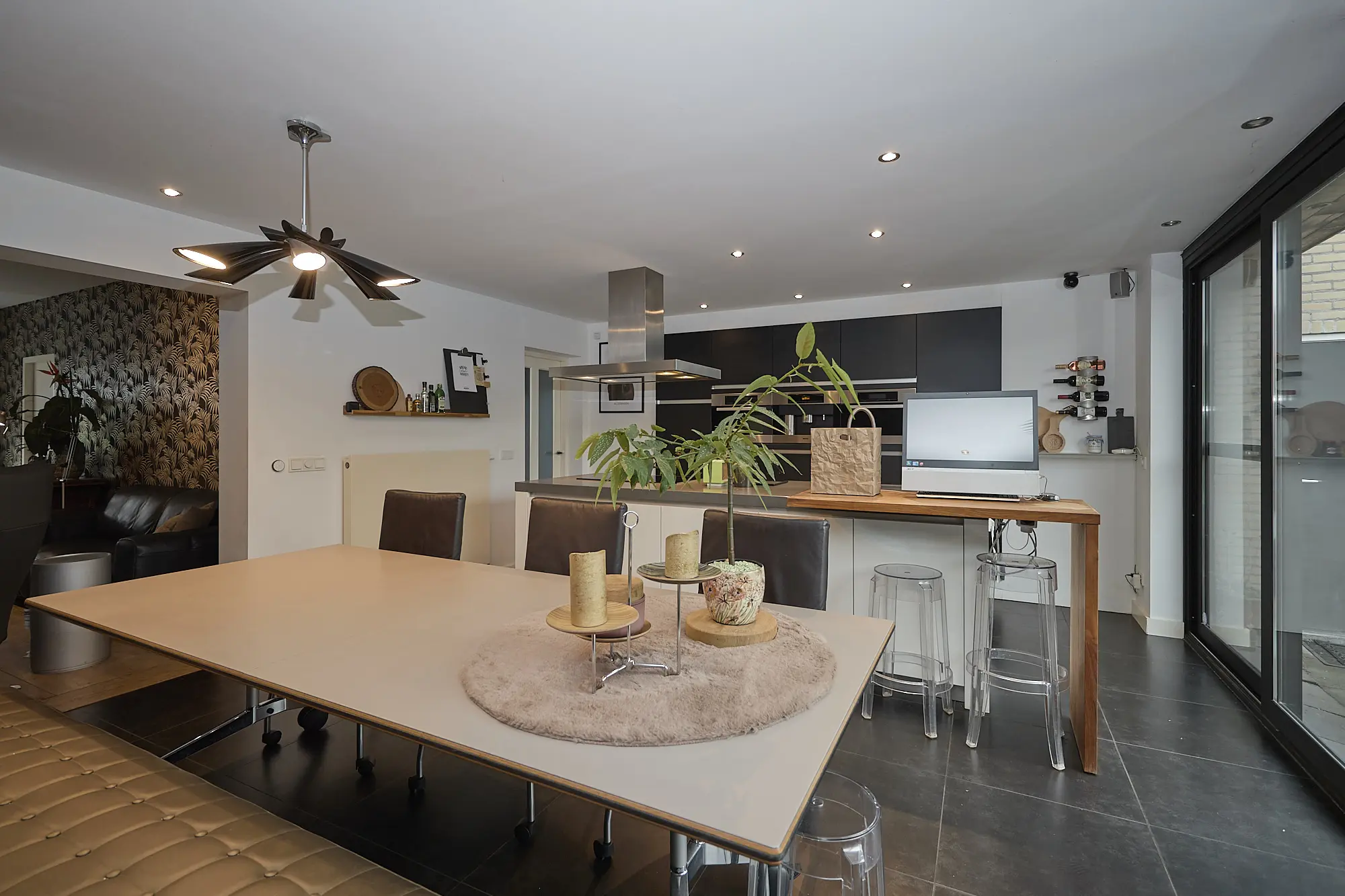 Bij binnenkomst ervaar je direct de warme, uitnodigende sfeer die deze woning zo bijzonder maakt. De woonkamer heeft uitzicht op het groene plantsoen en vormt het hart van het huis, perfect voor gezellige familieavonden of ontspannen momenten. De royale woonkeuken is een heerlijke plek om samen te koken en te genieten van goede gesprekken aan de eettafel. De keuken beschikt over diverse inbouwapparatuur zoals inductie kookplaat, afzuigkap, combi-magnetron en combi stoomoven, koelkast, diepvries en vaatwasser. Door de brede schuifpui richting de tuin worden binnen en buiten één.