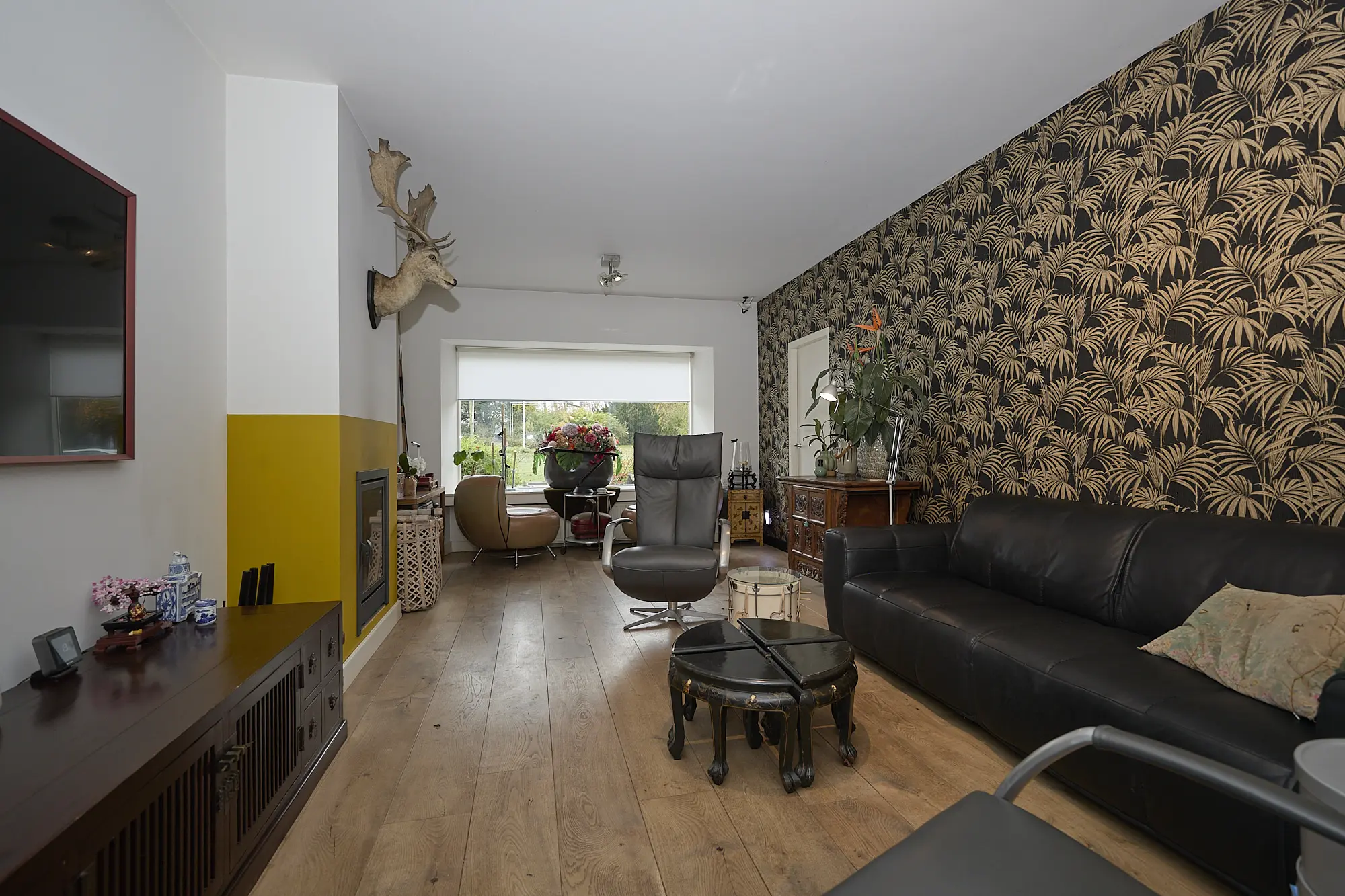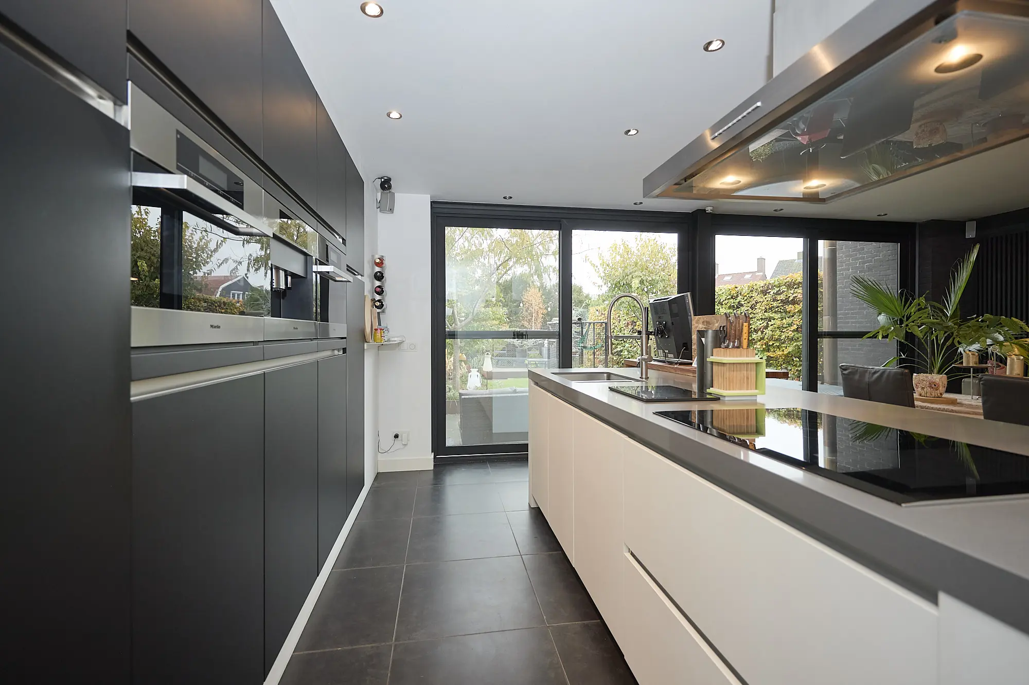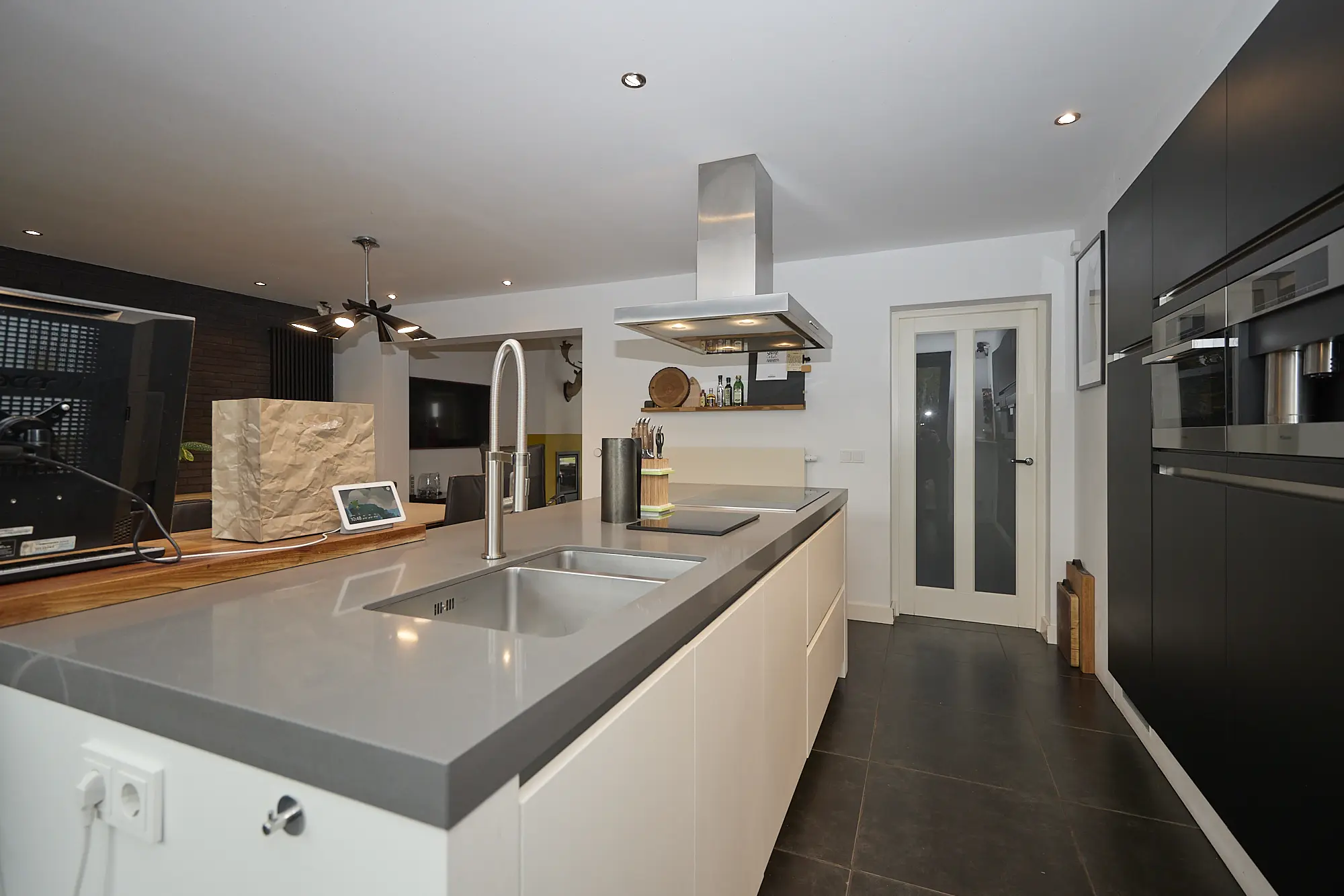Bij binnenkomst ervaar je direct de warme, uitnodigende sfeer die deze woning zo bijzonder maakt. De woonkamer heeft uitzicht op het groene plantsoen en vormt het hart van het huis, perfect voor gezellige familieavonden of ontspannen momenten. De royale woonkeuken is een heerlijke plek om samen te koken en te genieten van goede gesprekken aan de eettafel. De keuken beschikt over diverse inbouwapparatuur zoals inductie kookplaat, afzuigkap, combi-magnetron en combi stoomoven, koelkast, diepvries en vaatwasser. Door de brede schuifpui richting de tuin worden binnen en buiten één.
