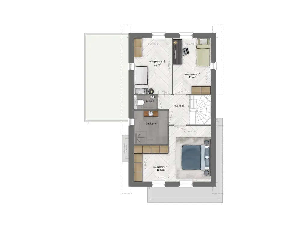 Op de eerste verdieping vindt u een overloop met toegang tot 3 mooie slaapkamers, een badkamer en een apart toilet. Wenst u een grotere badkamer? Dat is zeker mogelijk!