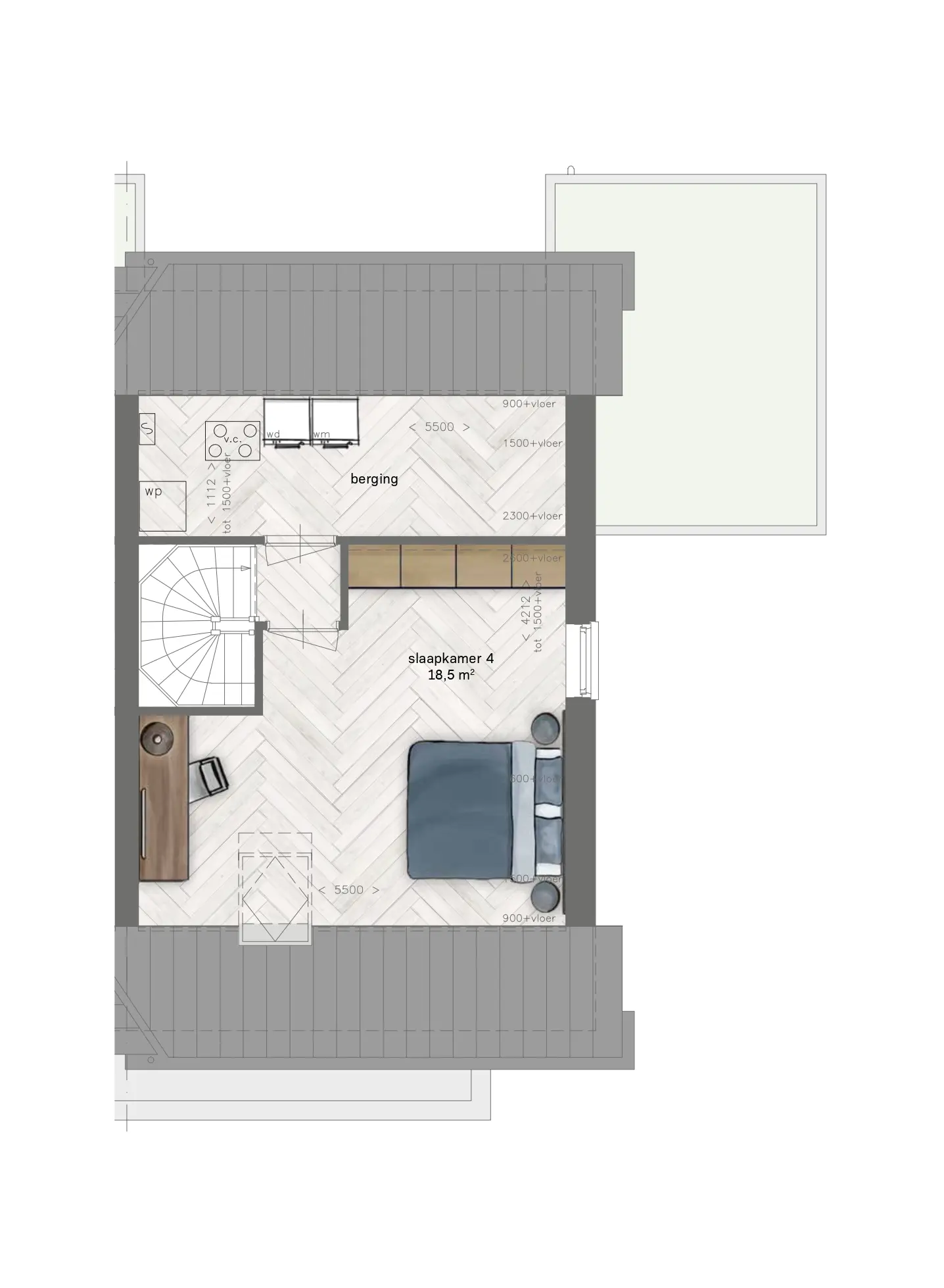 Op de tweede verdieping vindt u nog 1 grote ruimte. Die kan dienen als slaapkamer, maar ook als kantoor of hobbyruimte. Daarnaast is er een aparte berging waar u bijvoorbeeld uw witgoed mooi kunt plaatsen.