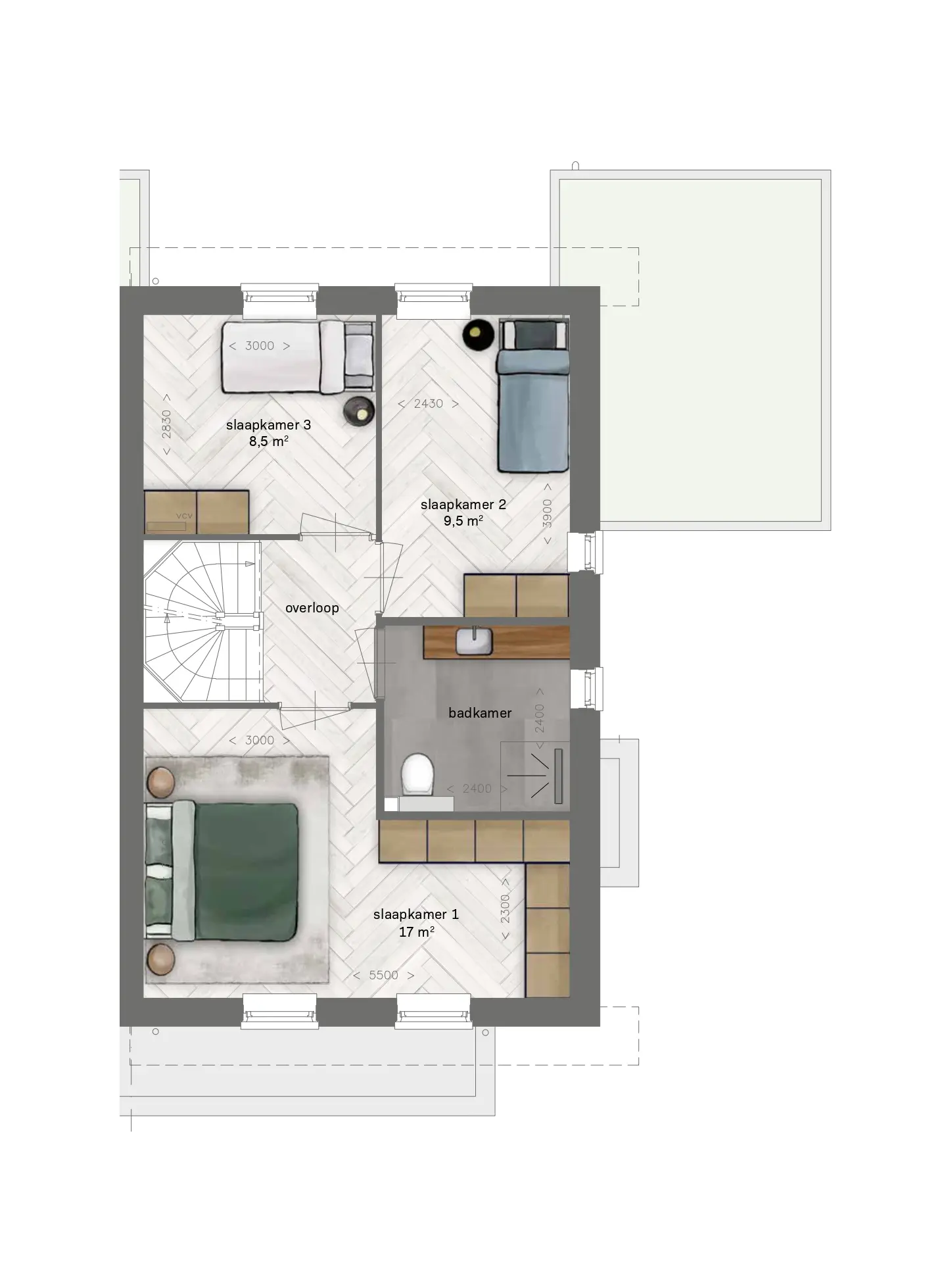 Op de eerste verdieping vindt u een overloop met toegang tot 3 mooie slaapkamers en een badkamer met toilet. Wenst u een grotere badkamer? Dat is zeker mogelijk!