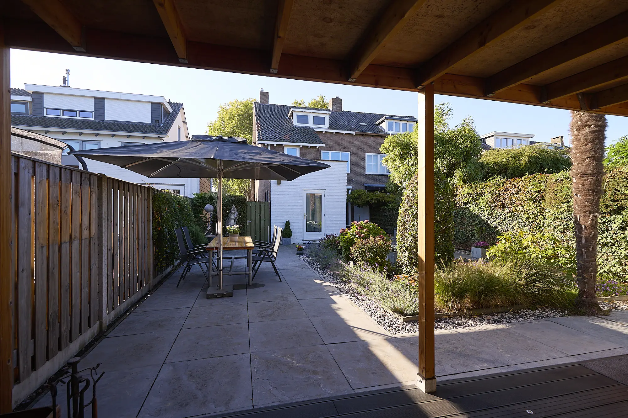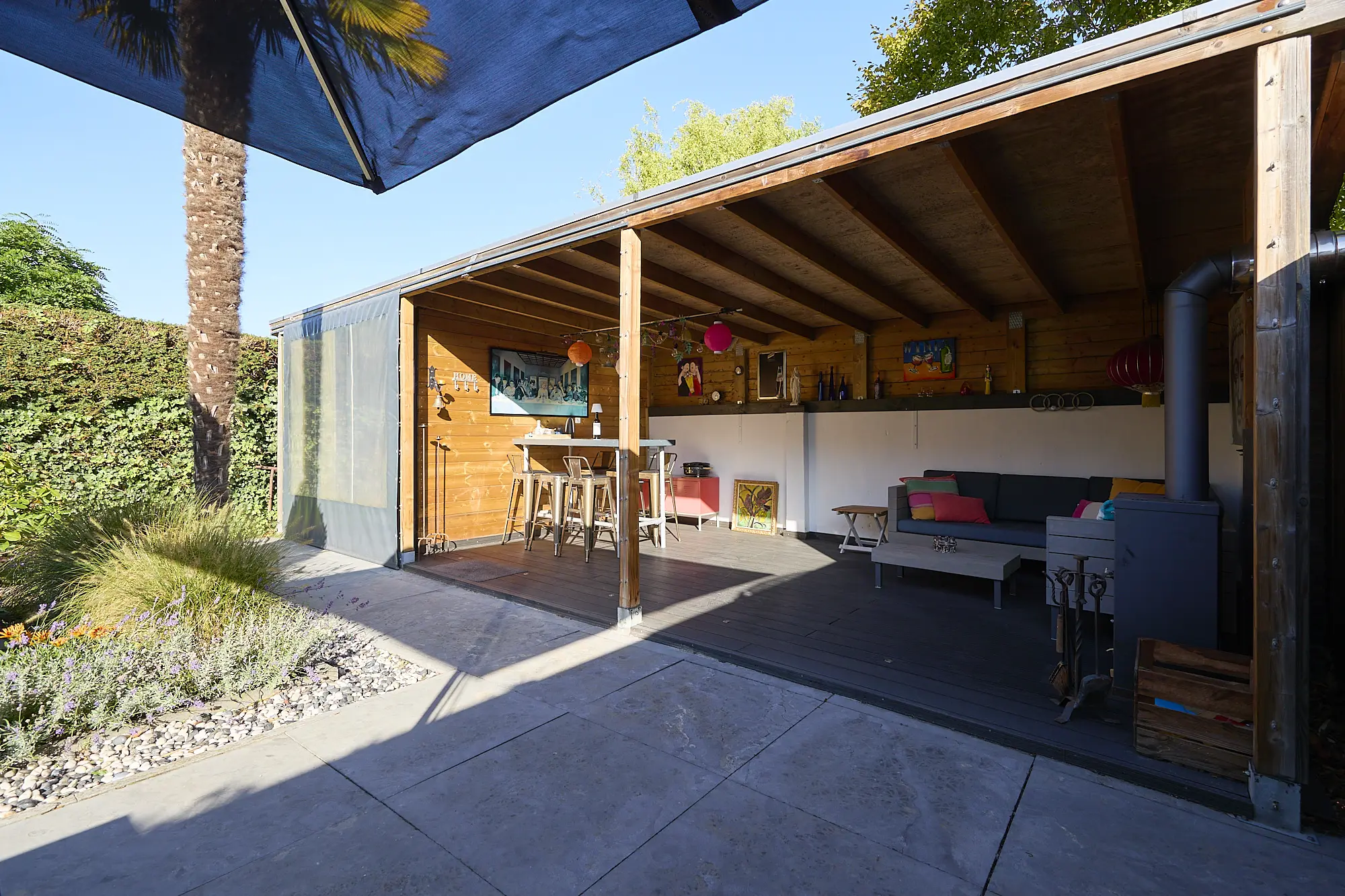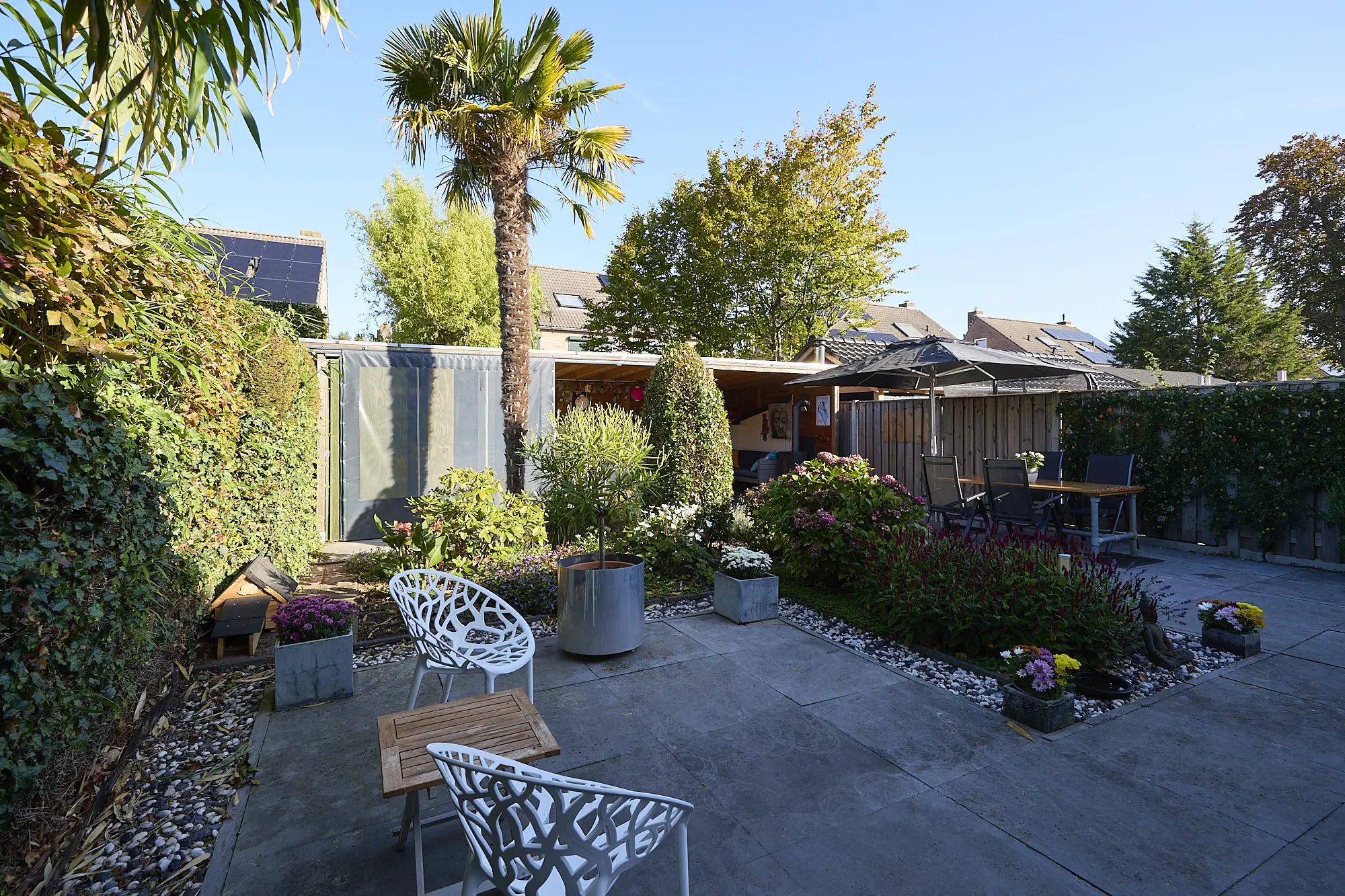 Een tuin met mediterrane flair. De tuin is een waar rustpunt. Dankzij de prachtige palmboom waant u zich hier even in mediterrane sferen. De beplanting is smaakvol en gevarieerd, met groene borders, kleurrijke accenten en meerdere fijne zitplekken. De ruime overkapping met (fietsen)berging maakt van uw tuin een verlengstuk van de woning. Beschut en sfeervol zit u hier van lente tot herfst heerlijk buiten, of het nu gaat om een rustig moment voor uzelf of een gezellige avond met familie of vrienden.