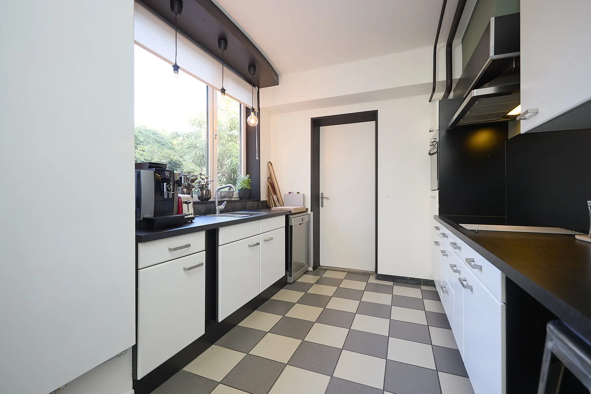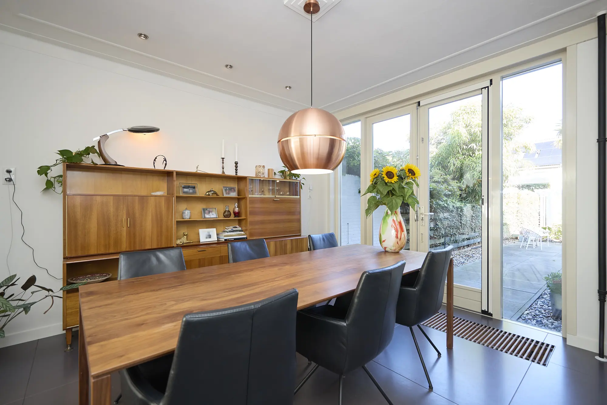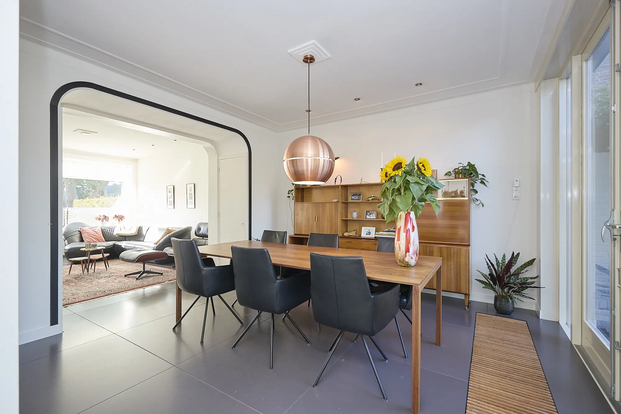 Wonen in stijl – licht, sfeer en zicht op groen. De woonkamer valt op door zijn royale ruimte en een fijne indeling: een ronde boog met aan weerszijden vaste kasten met deuren, die de zitkamer en eetkamer van elkaar scheiden zonder het ruimtelijke gevoel te verliezen. De zitkamer is gelegen aan de voor- én zijkant van de woning, waardoor u volop profiteert van natuurlijk licht en een fijn uitzicht op het plantsoen. Aan de zijkant is bovendien ruimte voor een extra zithoek – ideaal als leeshoek, werkplek of speelhoek voor de kinderen. De eetkamer biedt plaats aan een royale eettafel waar u met gemak gasten ontvangt. Via de openslaande tuindeuren stapt u zo de tuin in, waardoor binnen en buiten op natuurlijke wijze in elkaar overlopen. Perfect voor lange zomeravonden, etentjes met vrienden of gewoon een kop koffie in de ochtendzon.