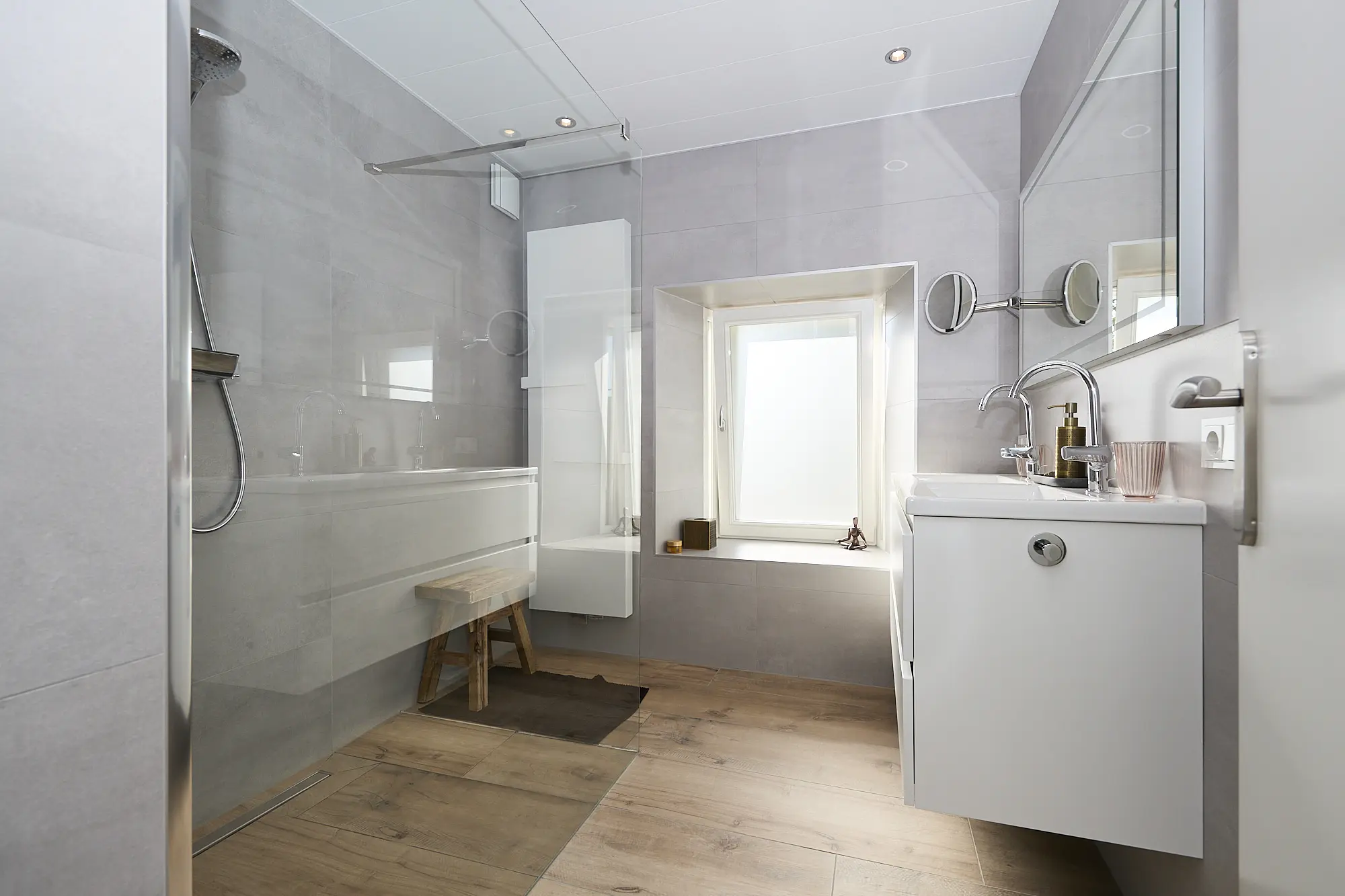 Verdieping met comfort, licht en fijne kamers. Op de eerste verdieping draait alles om rust en comfort. De overloop geeft toegang tot een apart toilet, de recent volledig vernieuwde badkamer en drie prettig ingedeelde slaapkamers. De hoofdslaapkamer is ruim en stijlvol, en heeft als extra pluspunt een directe verbinding met de badkamer. Ook de andere slaapkamers zijn goed van formaat; één is voorzien van praktische vaste kasten, de ander heeft toegang tot het platte dak boven de bijkeuken. De badkamer is een heerlijke plek om de dag te beginnen of juist rustig af te sluiten. Het geheel is sfeervol vormgegeven met rustige kleuren en een open, ruimtelijke indeling. De inloop douche is royaal, de dubbele wastafel biedt comfort voor twee en de afwerking straalt rust en zorg uit. Alles ademt hier ontspanning, kwaliteit en aandacht voor detail.