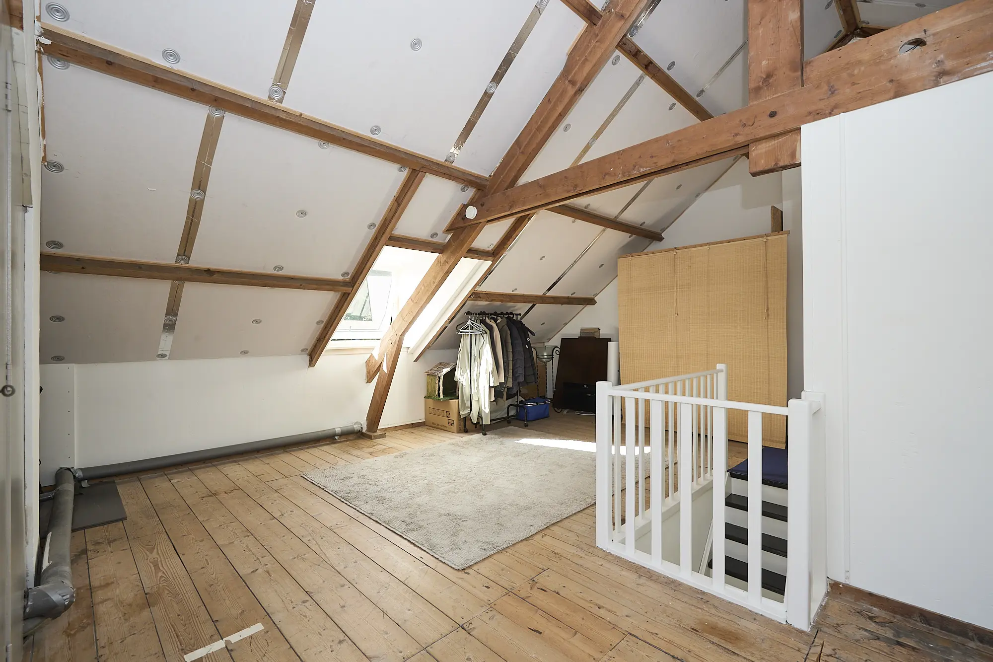 Ruimte in overvloed op zolder. De vaste trap leidt naar de tweede verdieping, waar u opnieuw verrast wordt door de ruimte. De overloop is zó ruim dat u hier met gemak een extra slaapkamer, werkplek of speelruimte – of misschien wel alle drie! – kunt creëren.