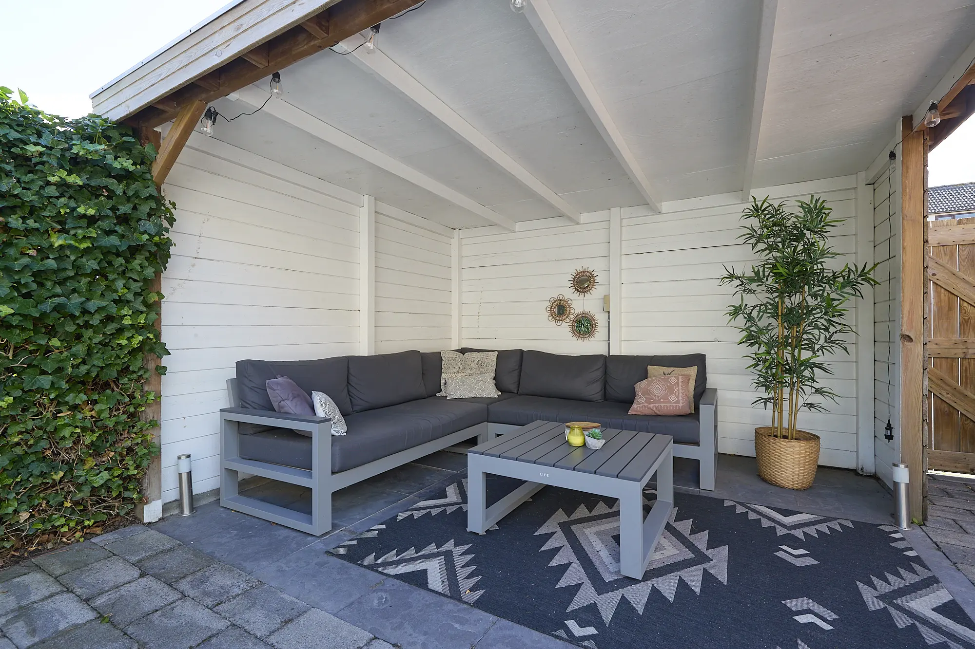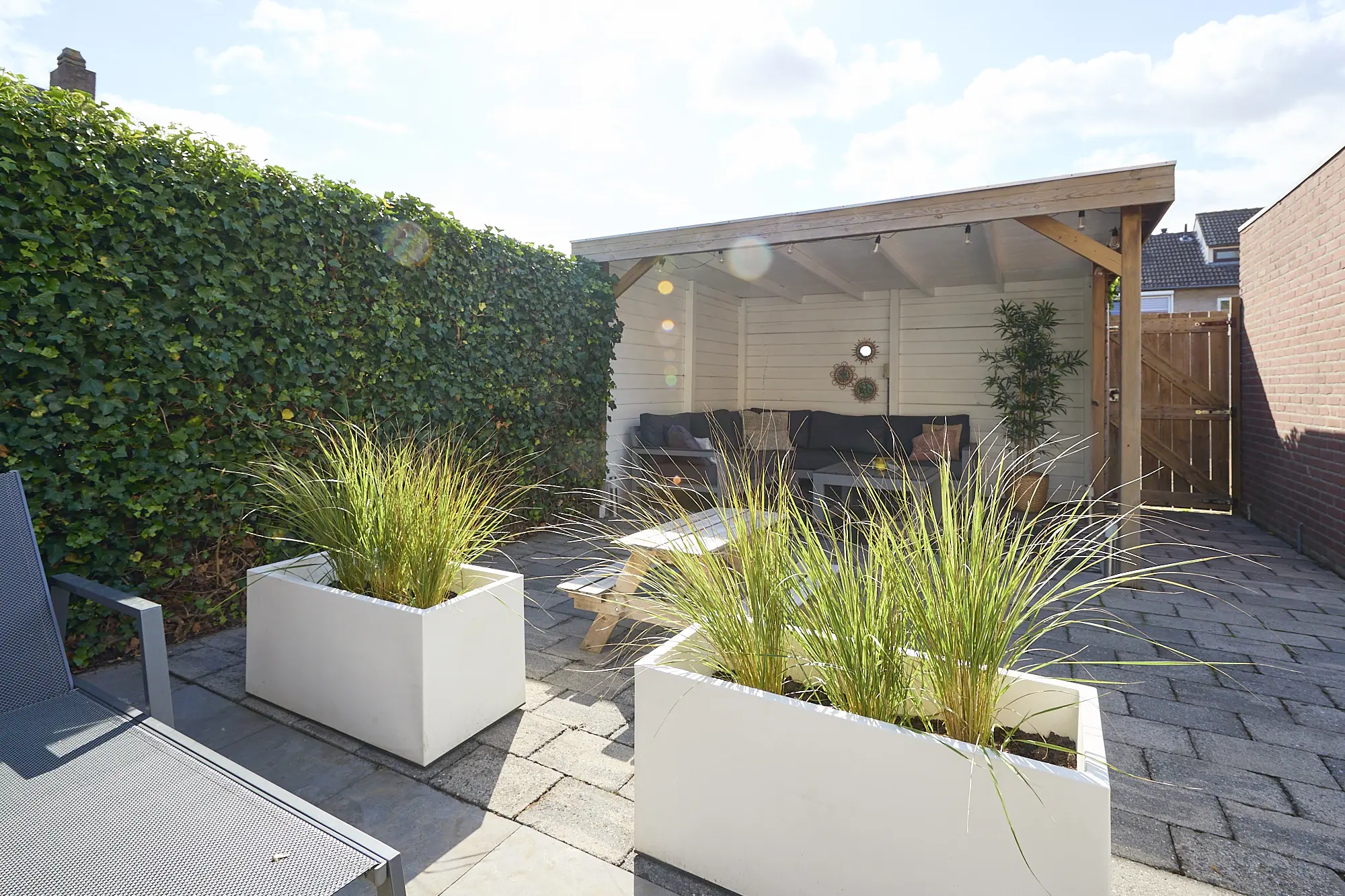 De grotendeels betegelde achtertuin is onderhoudsvriendelijk aangelegd en beschikt over een sfeervolle terrasoverkapping waar u in elk seizoen kunt genieten van het buitenleven. Daarnaast vindt u er een ruime stenen berging voorzien van elektra en een handige achterom naar de brandgang.