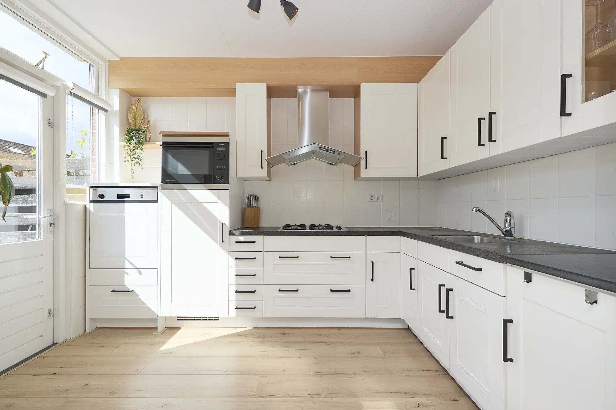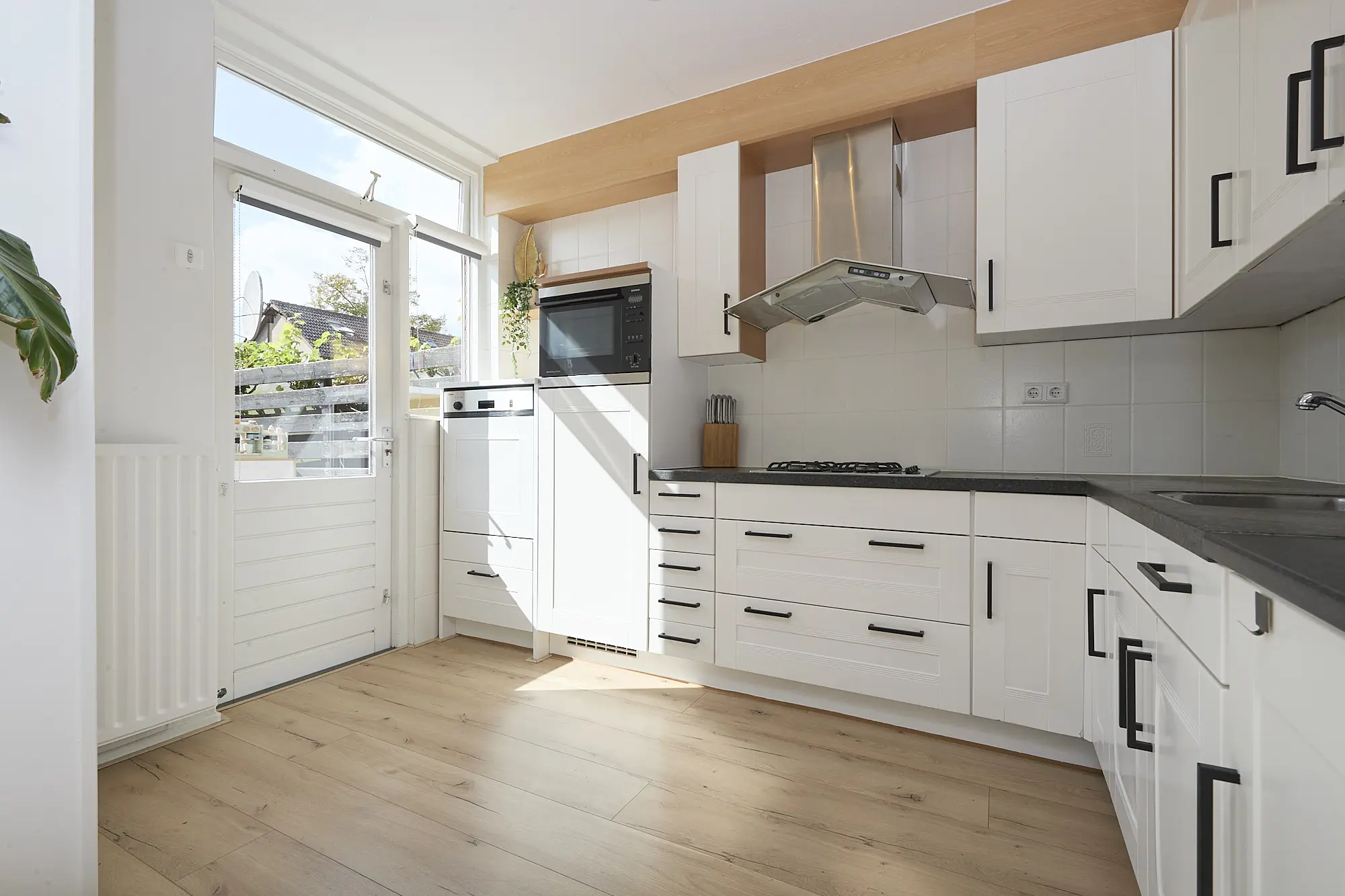 Via de hal met toilet, meterkast en open trap komt u binnen in de royale woonkamer. Grote raampartijen en openslaande tuindeuren zorgen hier voor veel licht en een prettige sfeer. De nette laminaatvloer geeft de ruimte een warme uitstraling. De open keuken is uitgerust met een moderne inbouwkeuken voorzien van gaskookplaat, afzuigkap, combi-magnetron, koelkast en vaatwasser. Vanuit hier stapt u zo de zonnige en onderhoudsvriendelijke achtertuin in met gezellige houten terrasoverkapping, een stenen berging en een achterom naar het garagepleintje.