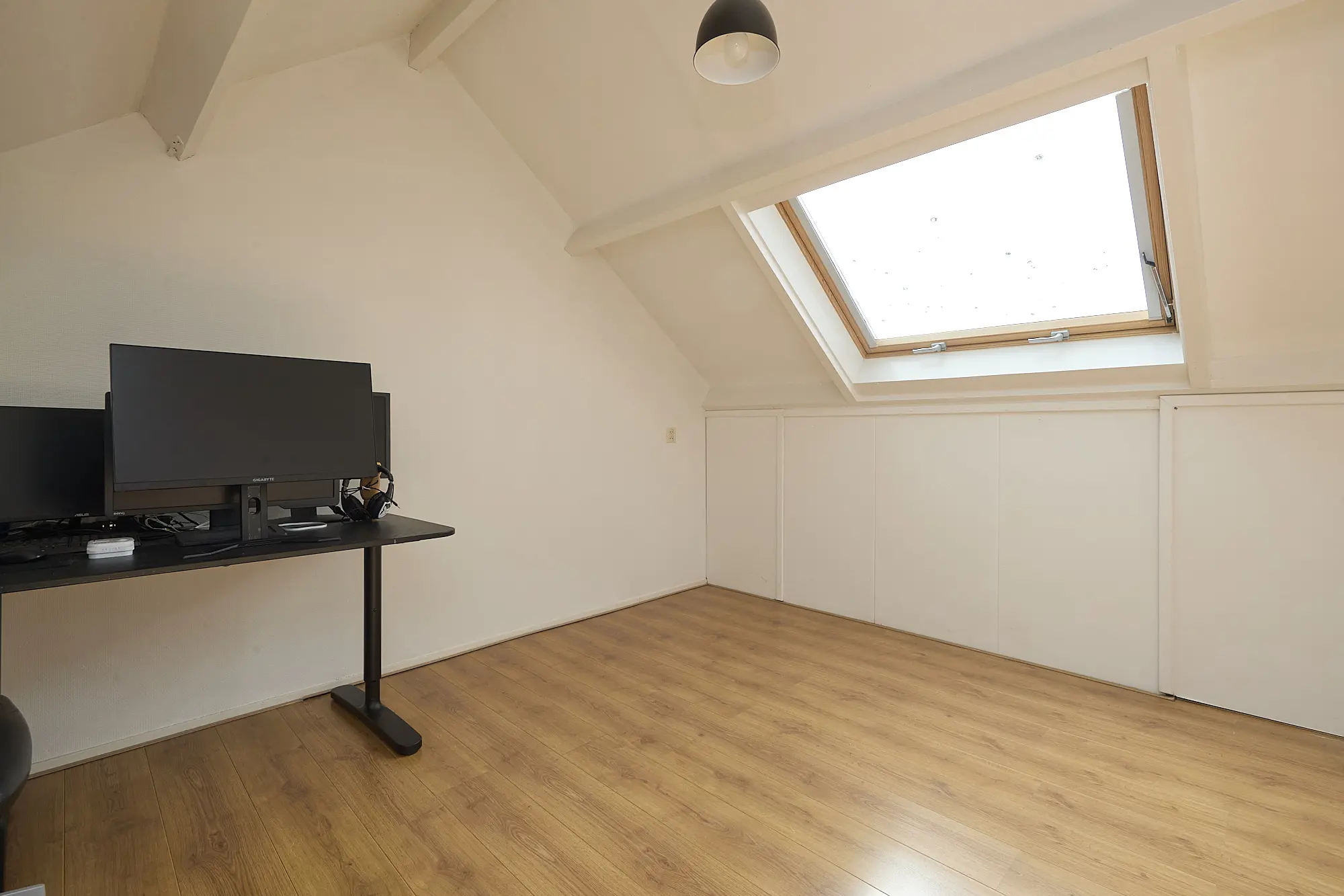 Overloop met wasruimte, cv-opstelling en een ruime vierde slaapkamer. Dankzij het grote dakraam is dit een lichte en veelzijdige kamer die uitstekend dienst kan doen als extra slaapkamer, werkkamer of hobbyruimte.