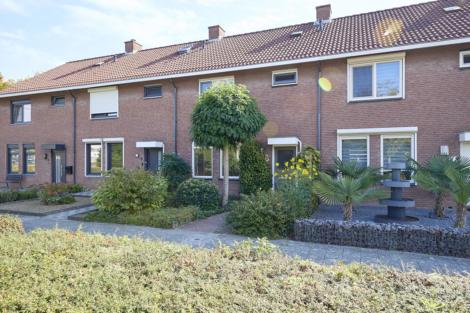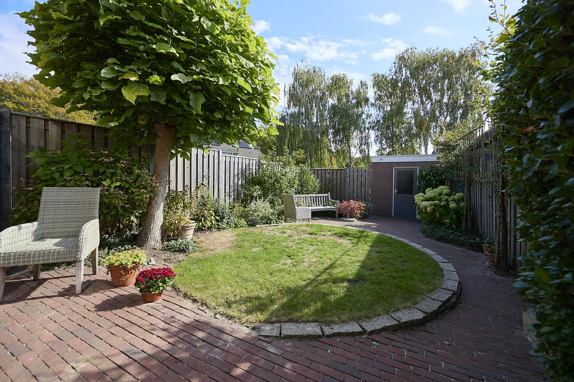 De achtertuin is onderhoudsvriendelijk en voorzien van een terras met zonnescherm, een gazon en een stenen berging met elektra. Via een poort aan de achterzijde is de tuin bereikbaar, met tevens een eigen parkeermogelijkheid.