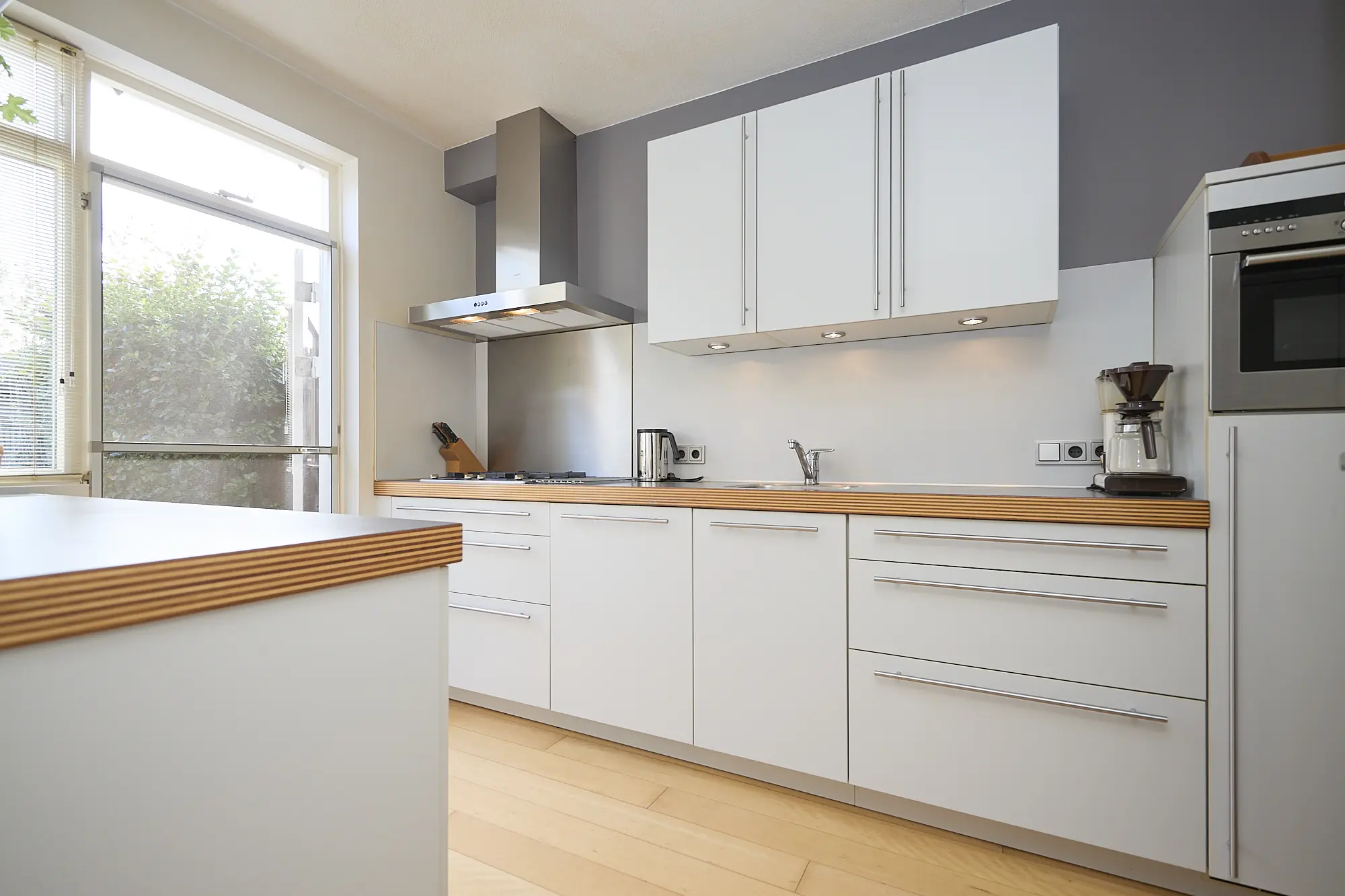 De keuken is aan weerszijden opgesteld en voorzien van alle gemakken: vaatwasser, gasfornuis, afzuigkap, combi-magnetron, koelkast en diepvries. Vanuit de keuken heeft u direct toegang tot de zonnige achtertuin.