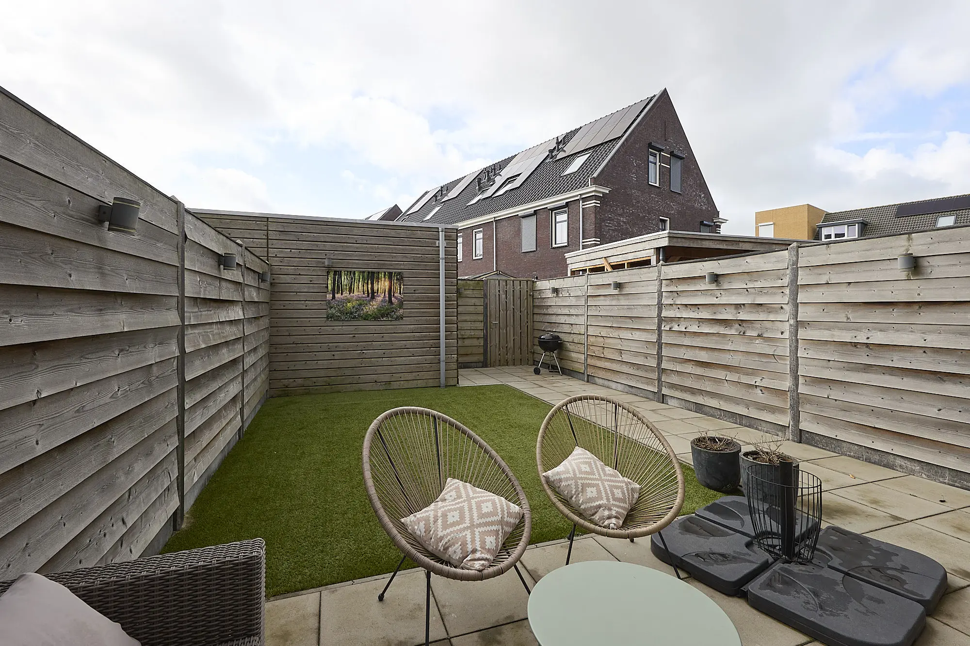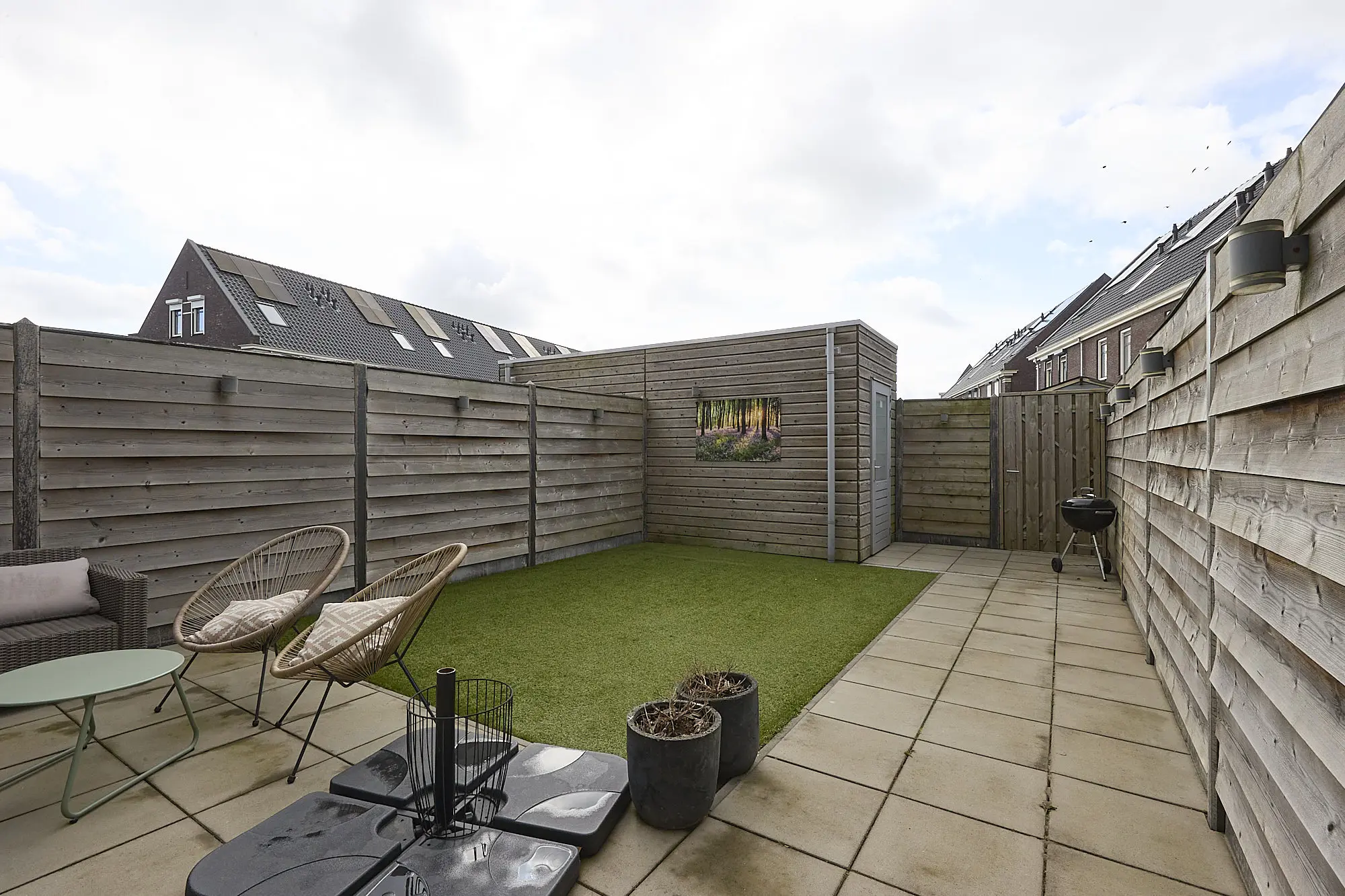 De achtertuin is keurig aangelegd en ligt op het zuiden, waardoor je hier volop van de zon kunt genieten. Met een zonnescherm voor de warme dagen en een praktisch tuinhuis voor extra bergruimte is het ook buiten goed voor elkaar.
