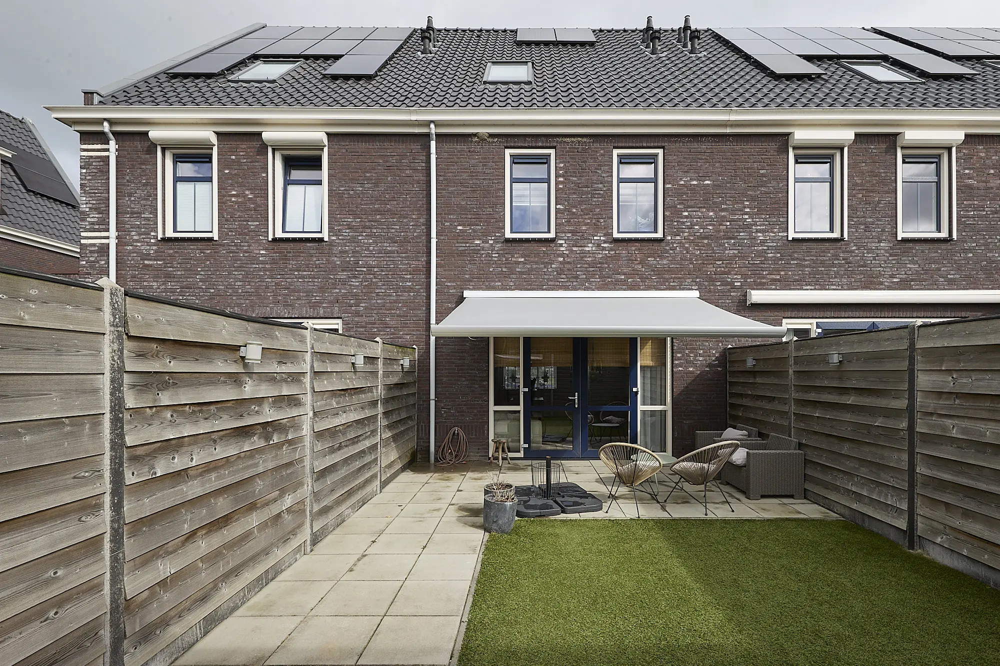 Aan de achterzijde ligt de tuingerichte woonkamer. Door de grote raampartijen en de gunstige ligging op het zuiden is dit een heerlijk lichte leefruimte waar binnen en buiten mooi in elkaar overlopen. Via de tuindeuren stap je zo het terras en de achtertuin in – ideaal voor lange dagen buiten.