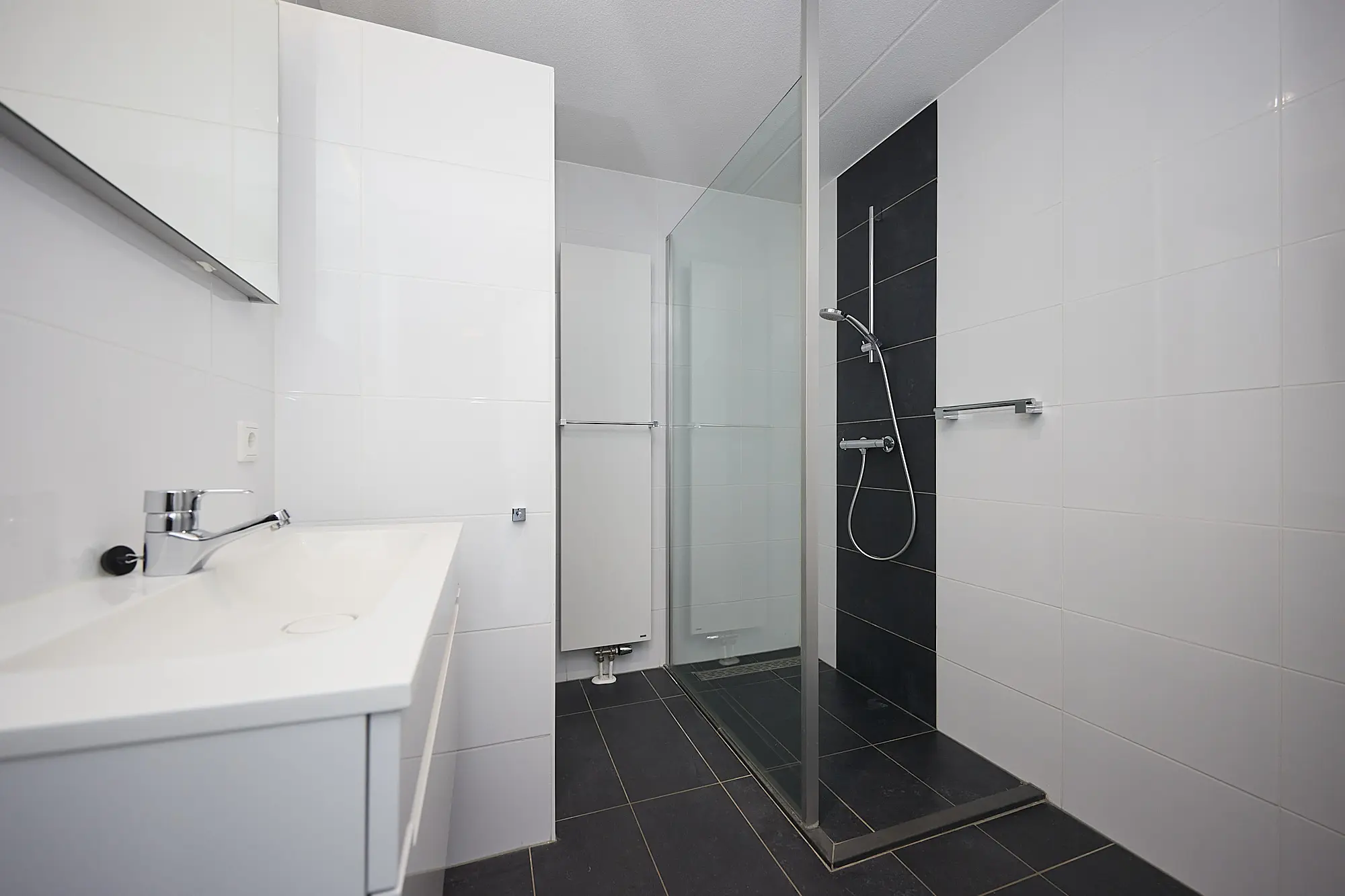 De badkamer is praktisch en volledig ingericht, met een inloopdouche, wastafelmeubel, designradiator en een aansluiting voor de wasmachine, waardoor comfort en functionaliteit hand in hand gaan.