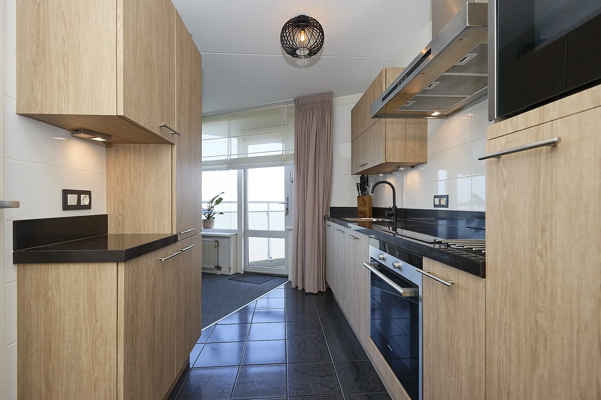 De moderne keuken is uitgerust met alles wat u nodig heeft: koelkast, vaatwasser, oven, combi-oven, inductiekookplaat en afzuigkap, zodat het bereiden van de lekkerste gerechten eenvoudig is. Aansluitend ligt de praktische bijkeuken, met ruimte voor een extra koelkast, vriezer en voorraad, waardoor alles netjes kan worden opgeborgen en de keuken overzichtelijk blijft.